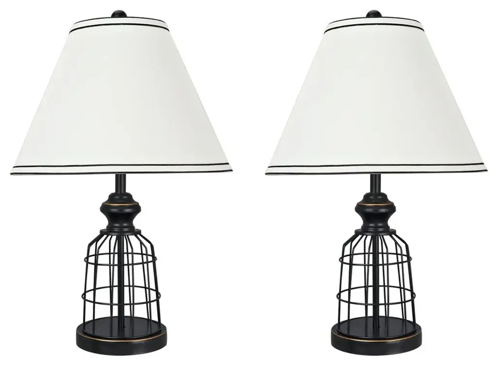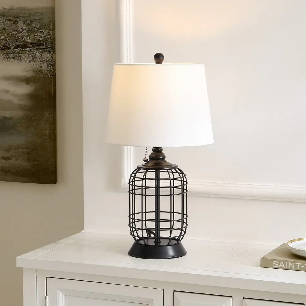 Bring vintage charm to your tabletop decor with our charming Pryce table lamp. Showcasing a cage-style body and stunning details, our vintage-inspired lamp remains a chic and charming addition. Its streamlined body instantly lends refined industrial aesthetics to any room. Featuring a black finish with a contrasting white empire shade, the table lamp attains an eye-catching presence. It lends a warm and ambient glow to cast intriguing shadows around the room. Our table lamp can bring a dose of style and charm to your desk, nightstand, console, or end table.