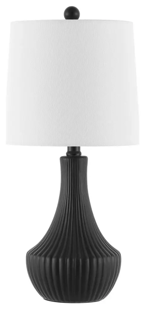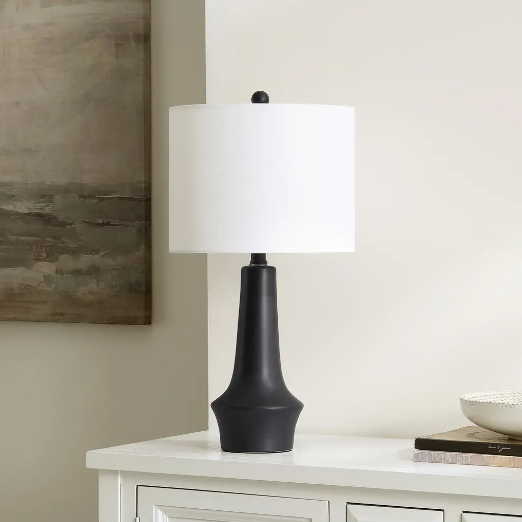 Bring modern charm to your tabletop with our Solyn table lamp. Boasting crisp lines and sleek curves, our table lamp vouches for a modern and chic presence. It features a tall and slender body to serve as a sophisticated and effortless addition to your modern home. Featuring a black ceramic body and a white drum shade, our table lamp strikes an impact with its high-contrasting finish. It diffuses a soft and warm glow to illuminate your desk, console, or nightstand in style.