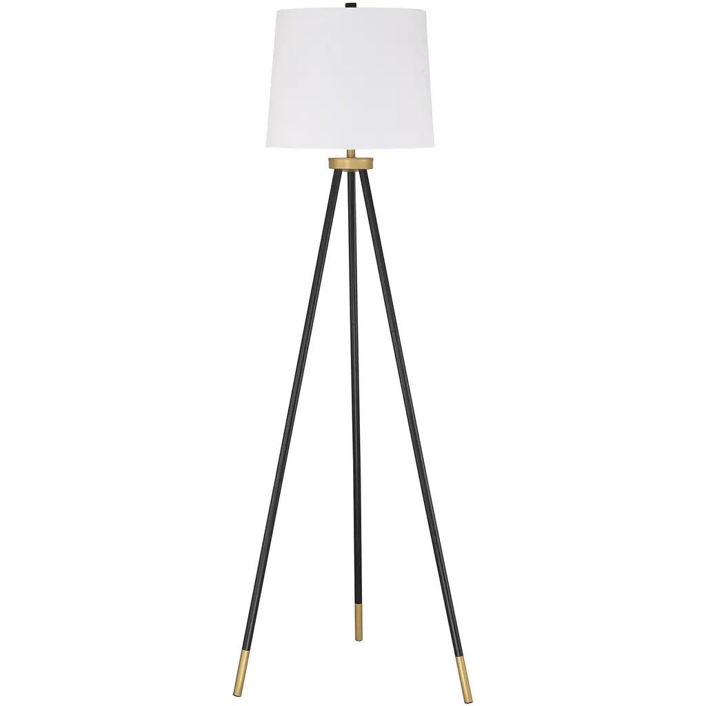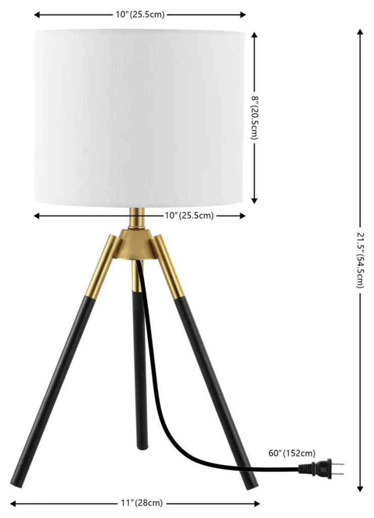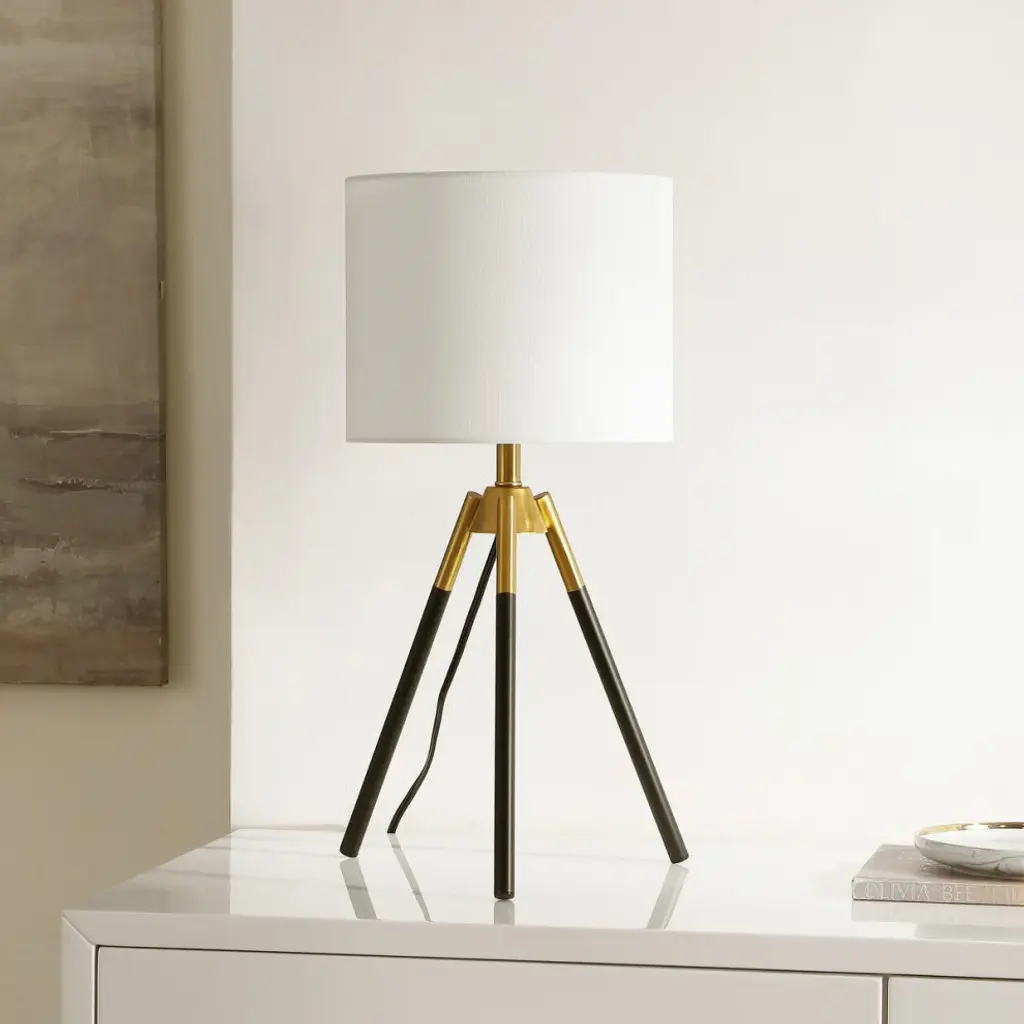 Add a dash of elegance and charm to your tabletop with our Jupiter table lamp. Modern details, sleek proportions, and a stunning mix of finishes make our lamp the perfect addition to your home. A sleek tripod base adds a distinct charm to the lamp. The base adorns a black metallic finish and brass accents to add a touch of polish to any tabletop. Completed with a white drum shade, our table lamp lends modern charm and a pleasant glow to your nightstand, console, or end table.