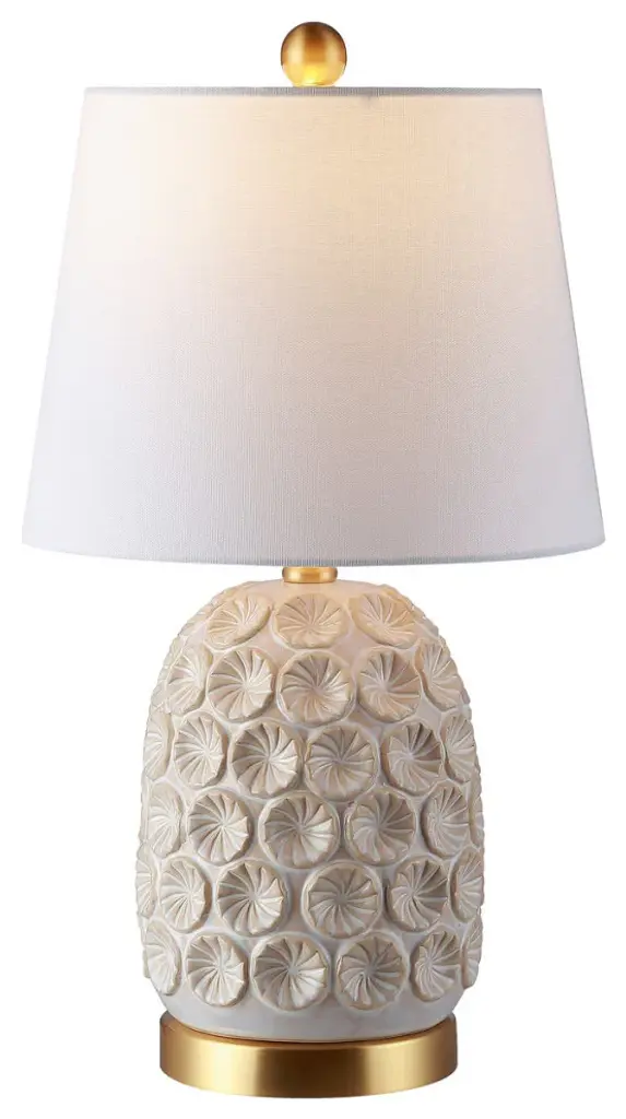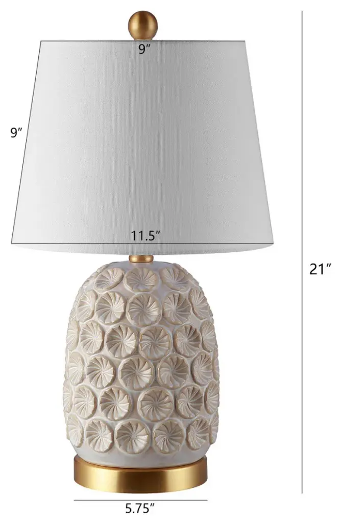 The beauty of hydrangea bushes is transformed into sophisticated sculptural decor in this Lamson Table Lamp. Its gold accents and clean white shade ensure Lamson shines sensationally in any room as a dramatic and decadent focal piece.Lamp Certified: ULType of bulb included: LED G45 4WNumber of bulb(s) included: 1Max Wattage :TYPE "A" 60W OR CFL 13W OR LED 9WLight Bulb Base Type: E26 Screw Terminal