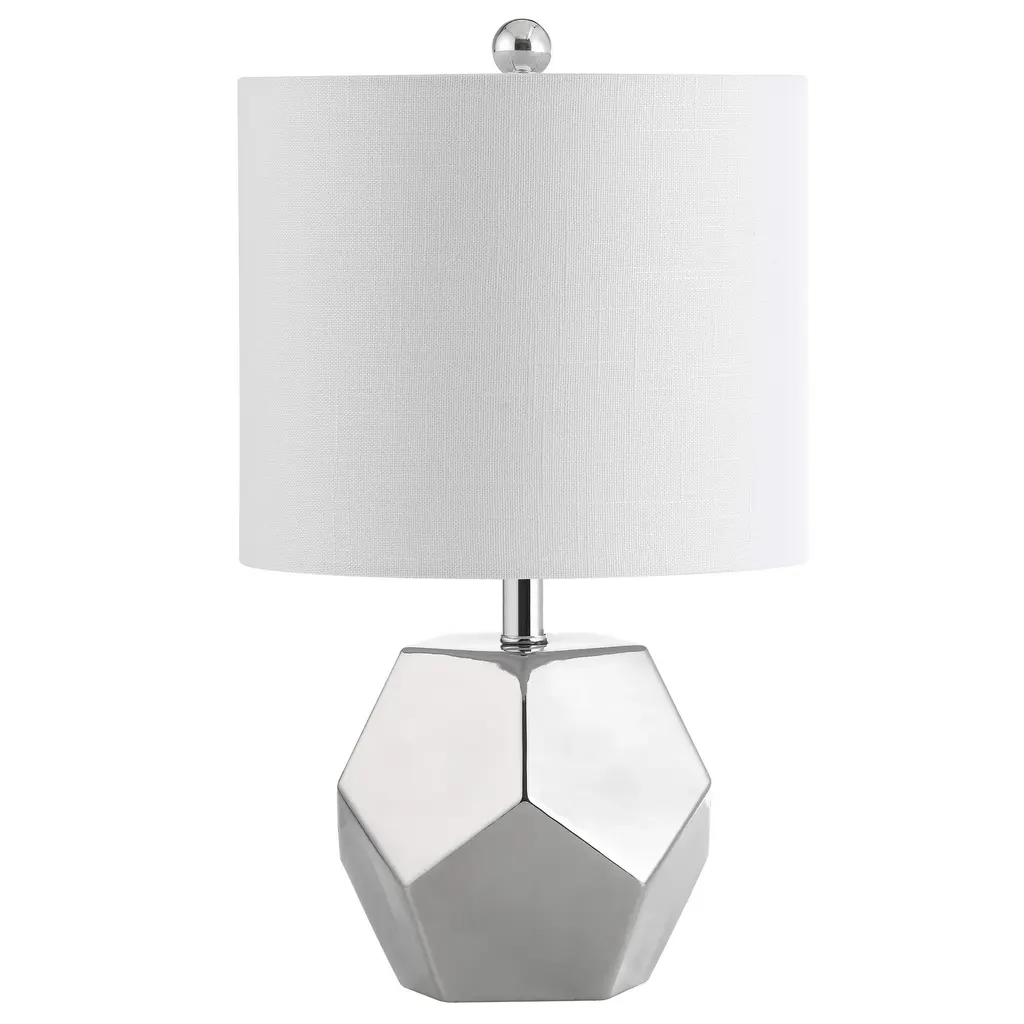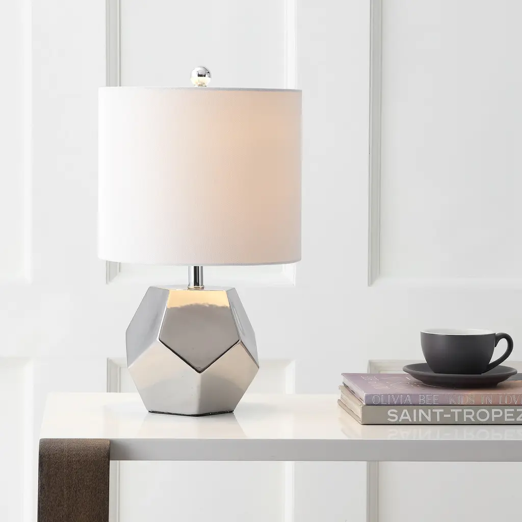 A modern gem, this contemporary table lamp refreshes any living room with its bold sculptural form. Its substantial design features a shimmering plated silver finish and matching finial that reflect the gentle glow from its elegant white shade.