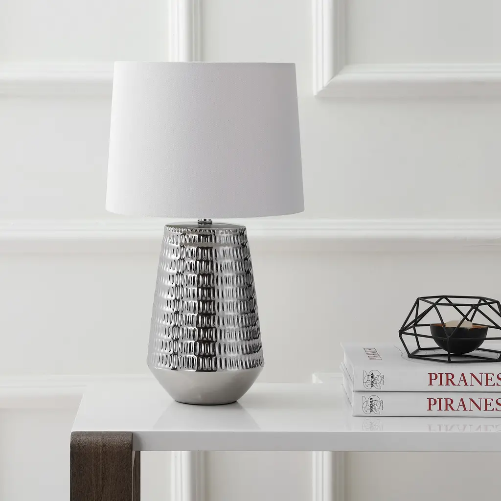 Inspired by the work of modern sculptors, this contemporary table lamp brings high style to the living room. Crafted with a subtle, delicate texture, its bold silver finish is refreshing and light. Its tapered shade casts a welcoming glow.