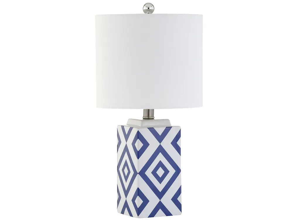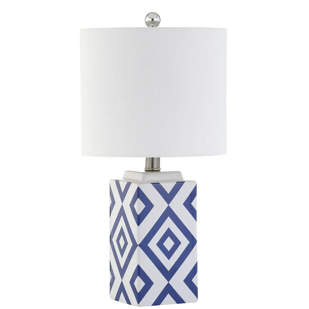 The perfect blend of style and substance, this contemporary table lamp gives a modern update to any living room. Designed to highlight its rich navy and white diamond pattern, its clean lines and white shade make it a designer favorite