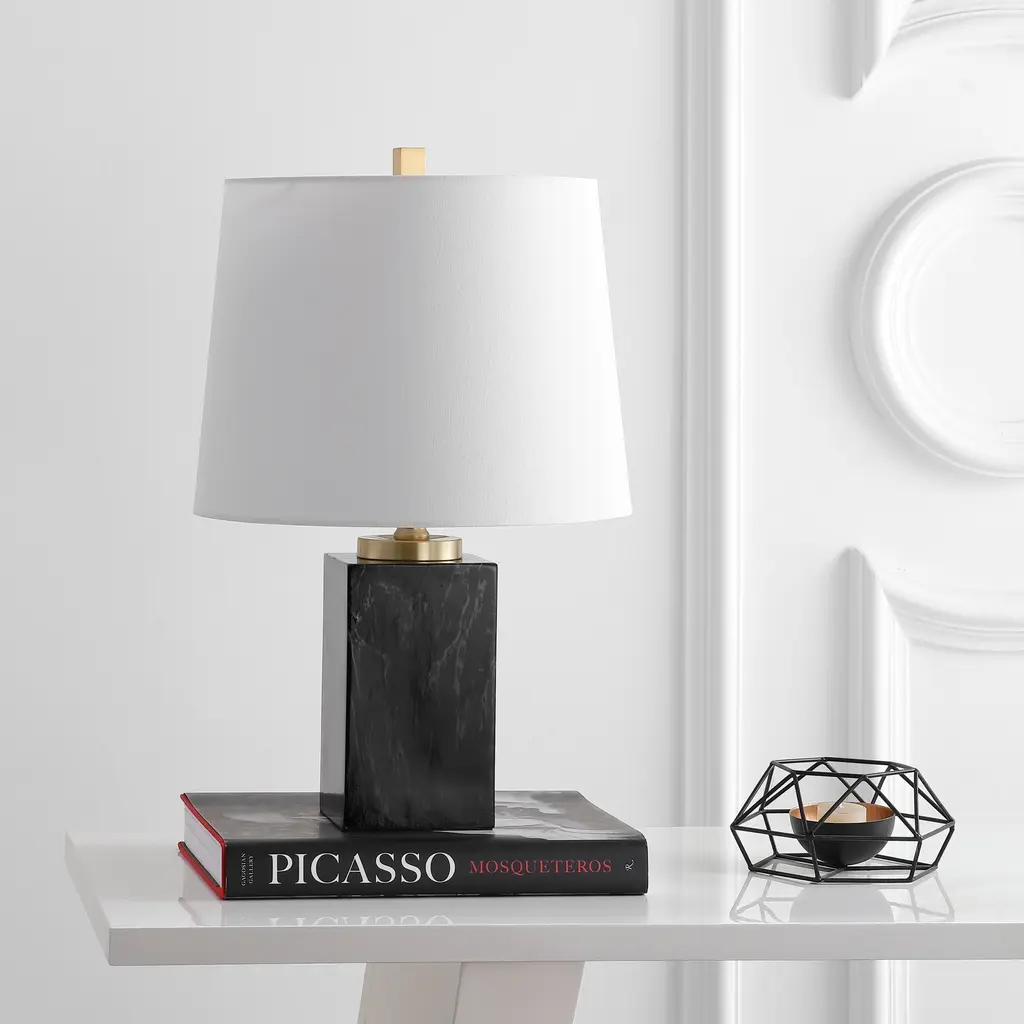 Bold and beautiful, this contemporary table lamp adds luxurious style to any living room. Designed with the timeless elegance of a dramatic black marble finish, its brass gold foundation shimmers underneath its complimentary off-white 100% cotton shade.