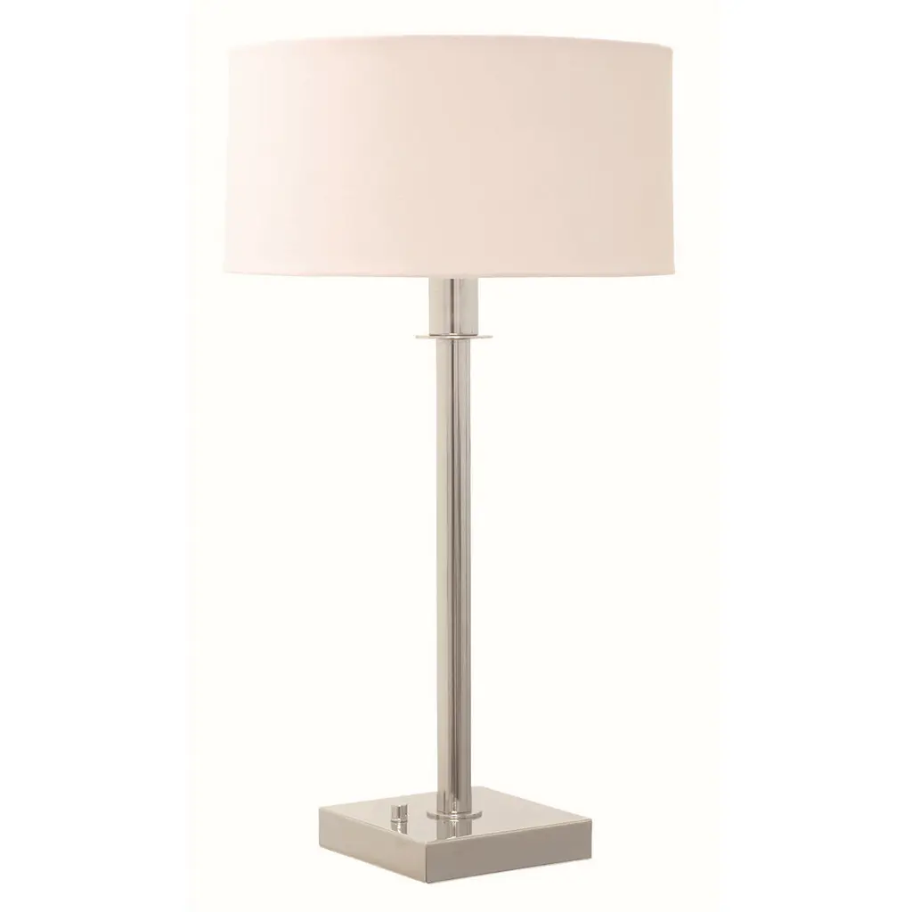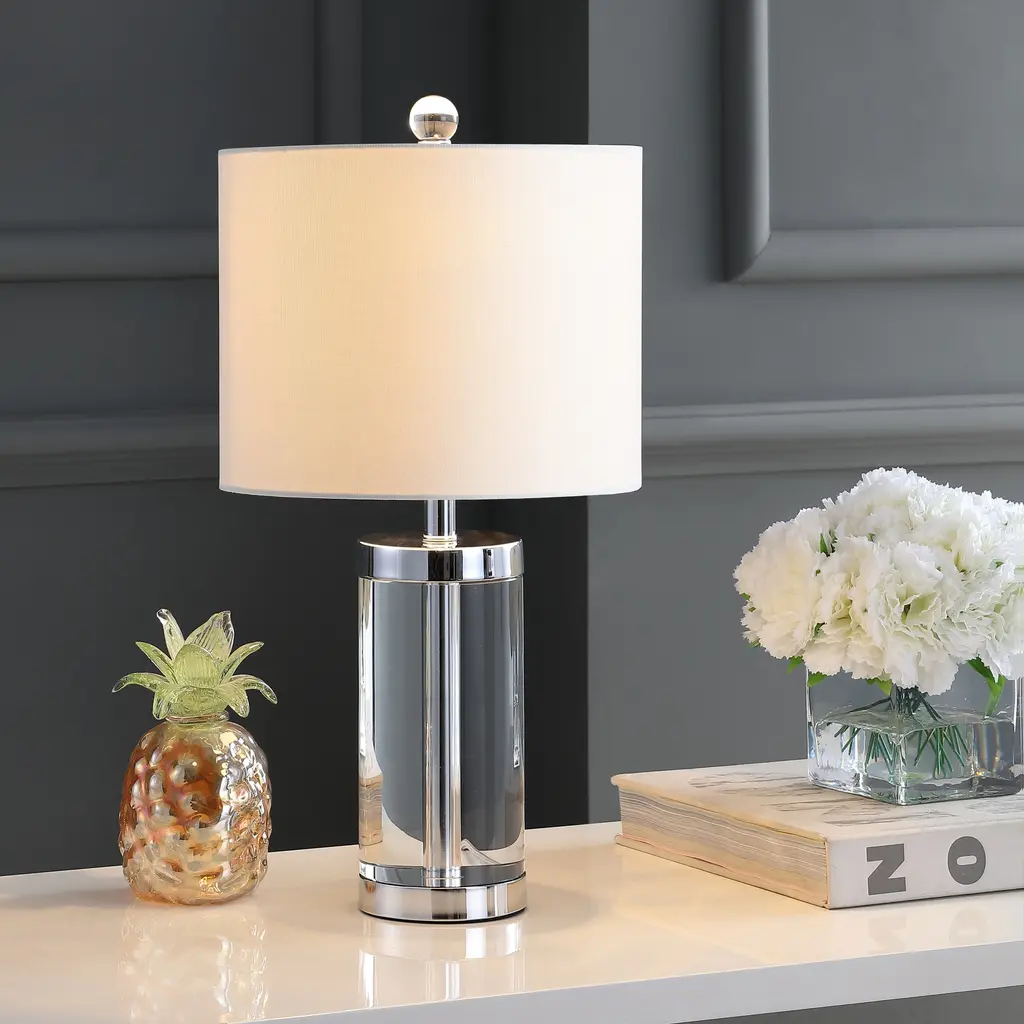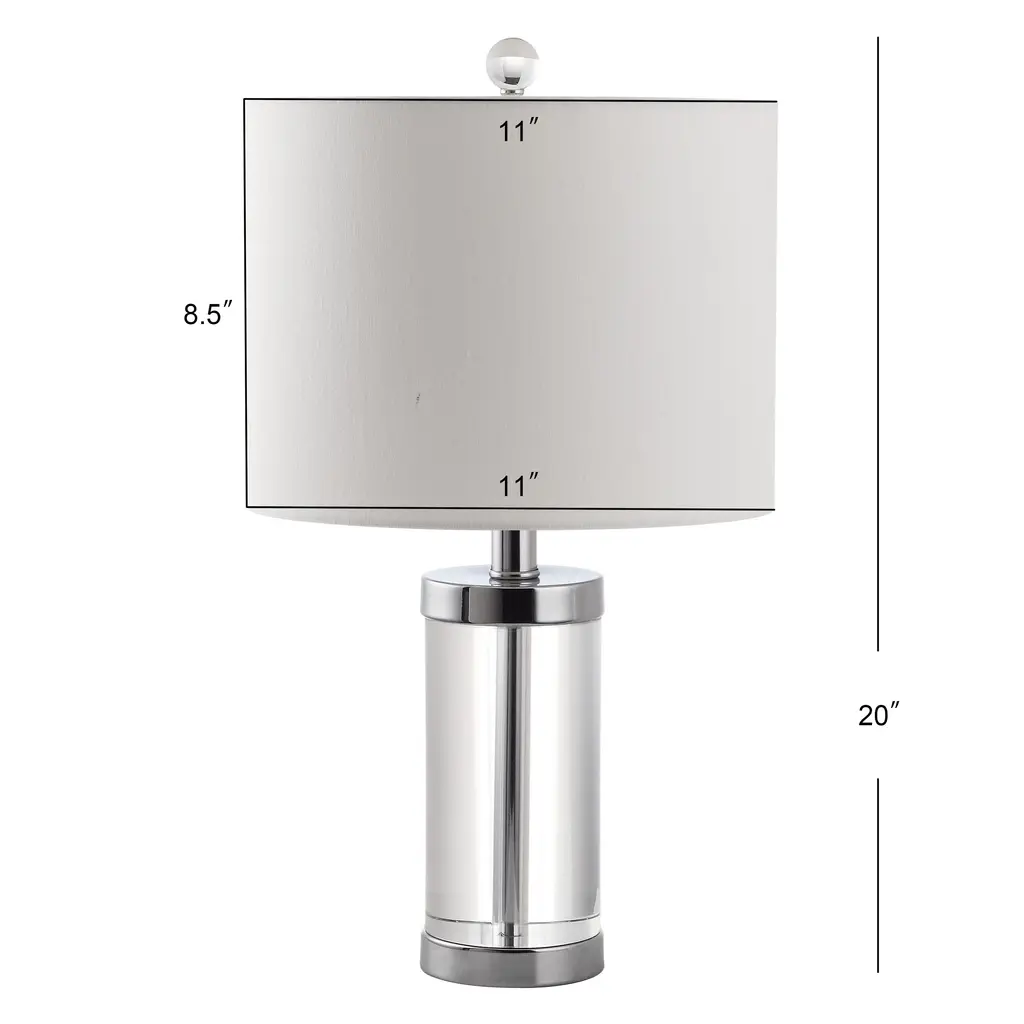These handsome Laurie table lamps feature silver bases, fittings and end caps enclosing a crystal cylinder in an elegant look that adapts to every style from traditional to contemporary. Complemented with a crisp white cotton drum shade in a linen weave, the Laurie crystal table lamps will enhance any room.Features:Setting: IndoorFixture finish: CrystalShades: Lighting has a linen white shadeSocket switchNumber of lights: 1Requires one (1) 100 watt bulb (included)Measures 20 inches high x 11 inches in diameterAssembly required.