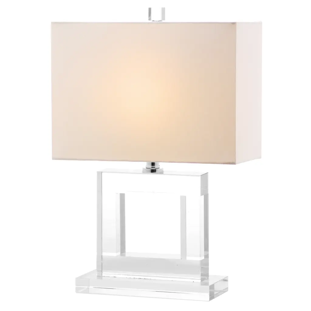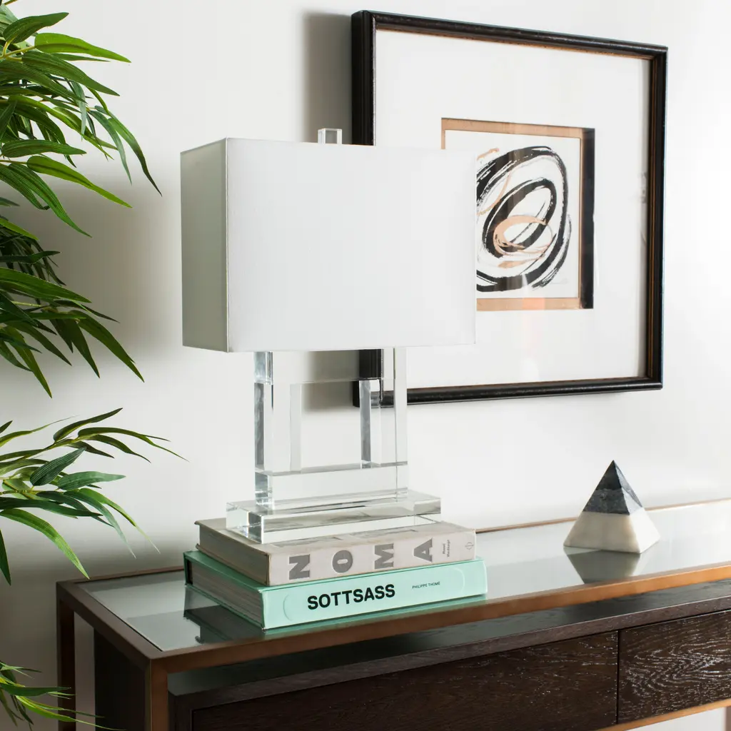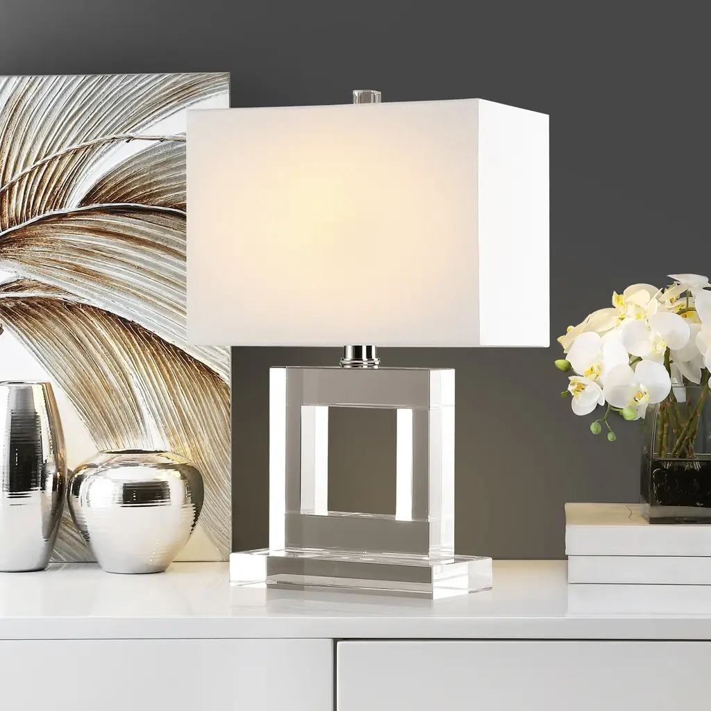 Graphic and handsome, the Town Square crystal table lamp makes a brilliant statement in transitional and contemporary rooms. From its square cutout crystal base and finial to the squared off drum shade, this lamp is sophisticated personified.Add a beautiful touch to your decor with this linear table lamp from SAFAVIEH. The chrome finish and starkly contoured shade present a formidable visual, grabbing attention from clear across the room while filtering light into your home. This table lamp is a great way to add dimension to your space.Features:Crystal finishset includes 1 lampLighting has a white linen shadeSocket switchConsists of 1 lightRequires one (1) 100-watt bulb (included)Assembly required.