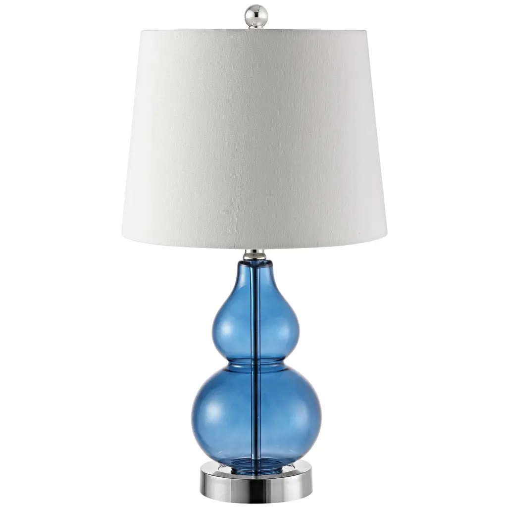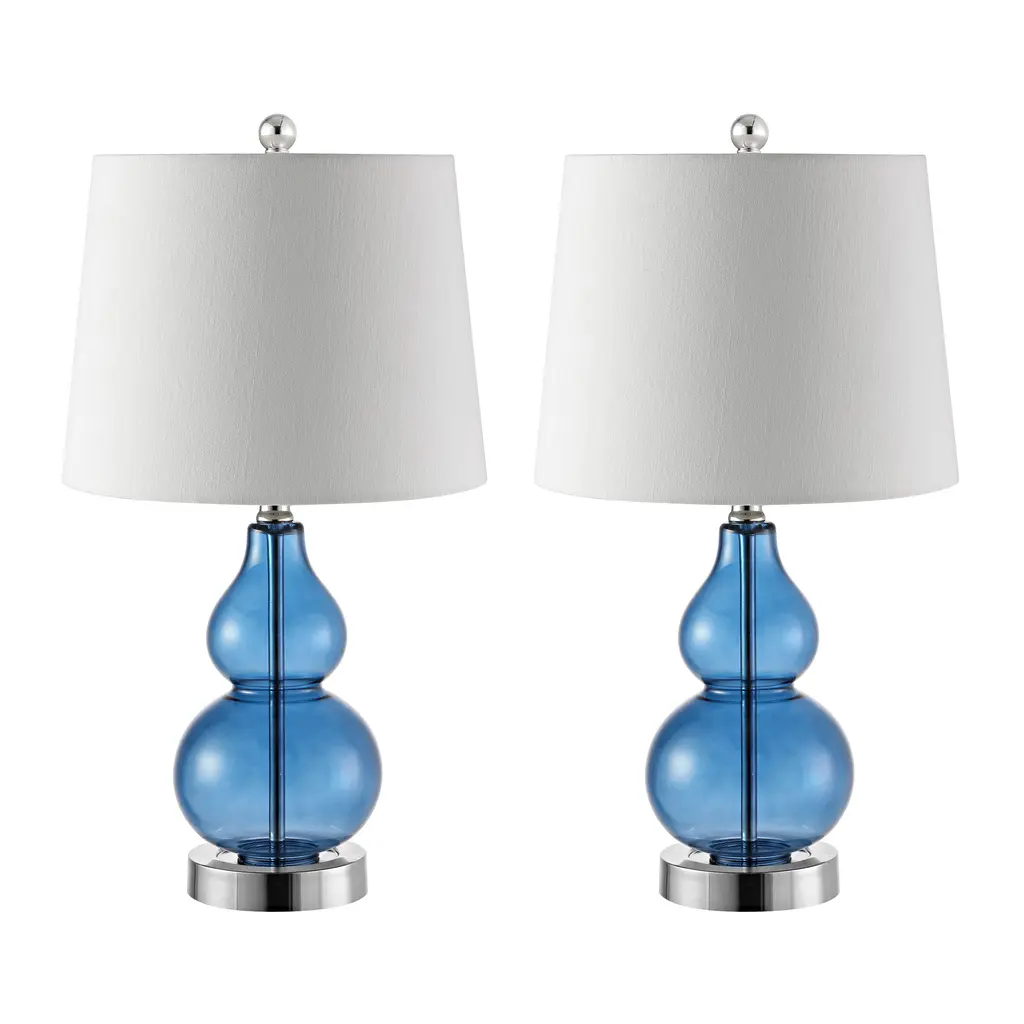 Set the stage for dynamic living with this colorful contemporary genie-style table lamp (Set of 2). A focal point in any living room or bedroom, it features finely crafted glass curves that sit atop a polished chrome base. Its white shade is complimentary.