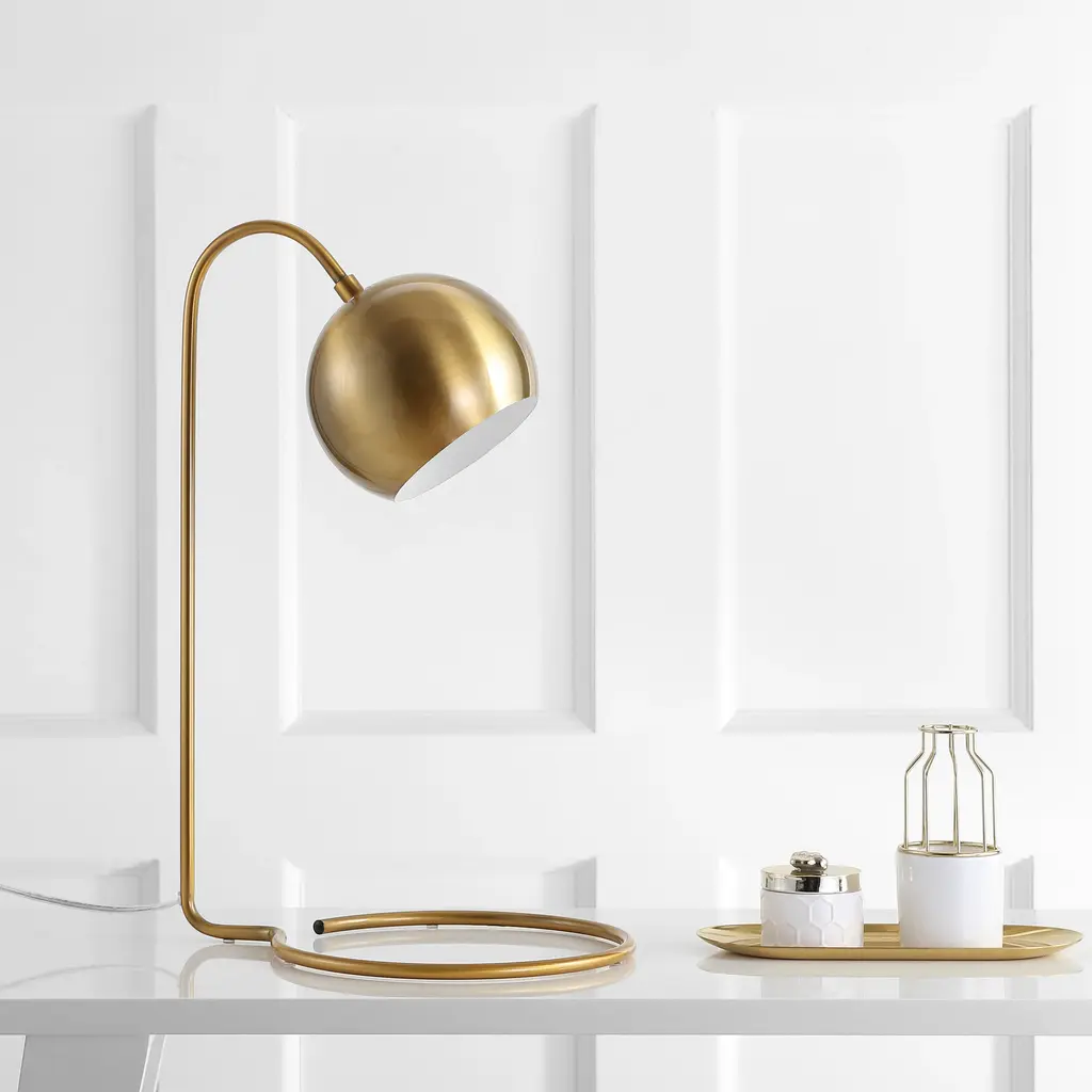 This contemporary desk table lamp brings a playful retro vibe to any living room. Its brass and gold finish elevates its mid-century style, while its elegant metal lines lend a modern, minimalist touch. Designers love its glamourous vintage-inspired shade.Bulb Wattage: 4WLighting Type: Table LampNumber of Lights: 1 LightLamp Type: Table LampMaterial: MetalLighting Style: ContemporaryColor: Gold