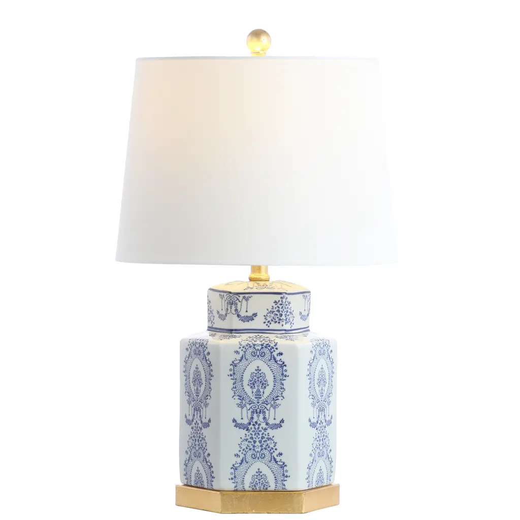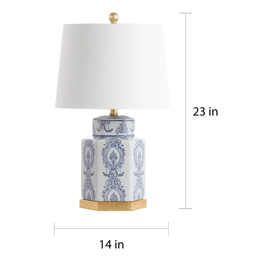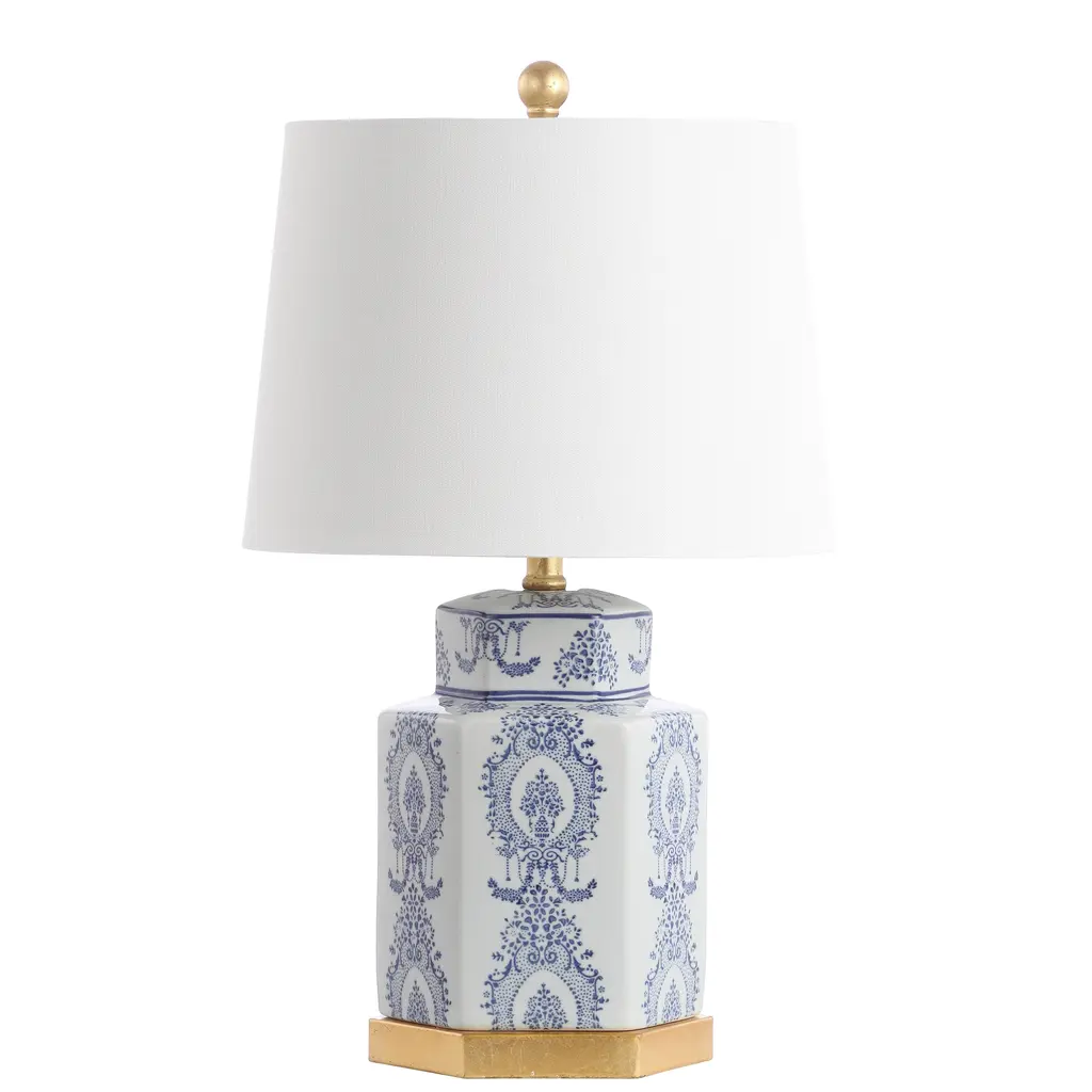 The charm and splendor of ancient ginger jars inspired the captivating look of this ornate and lovely set of lamps. The delightful pattern on the substantial ceramic body is in classic blue and white for a nod to Asian artistry, a rich gold leaf finish completing the artful look. An off-white cotton shade casts soft light around the room for a peaceful, enriching glow.Features: