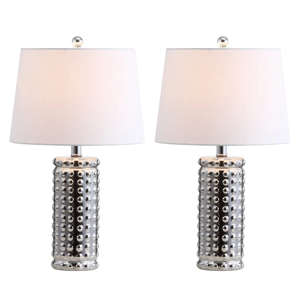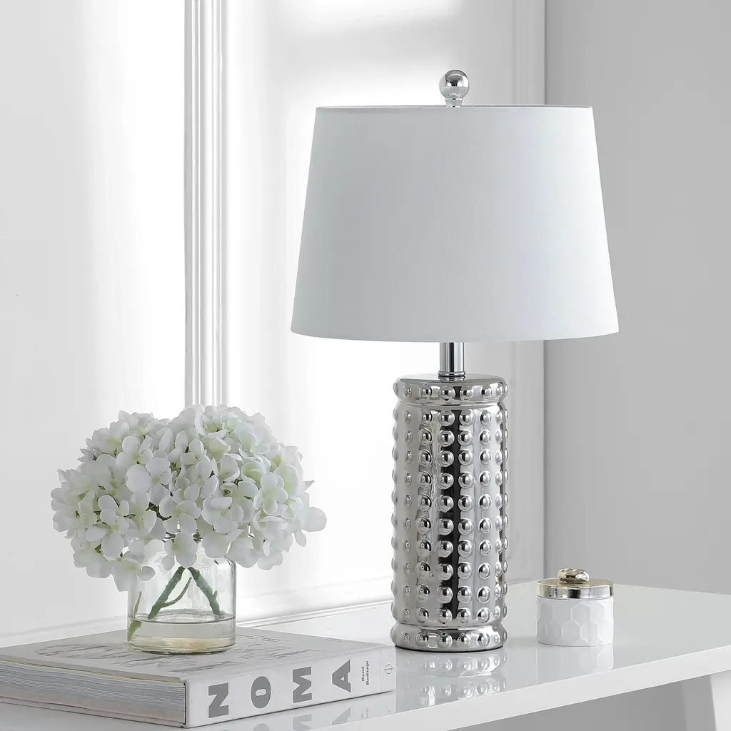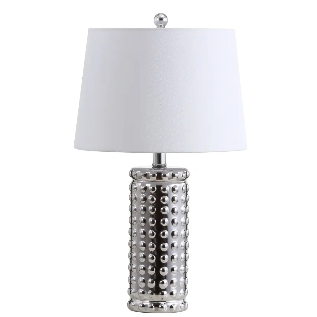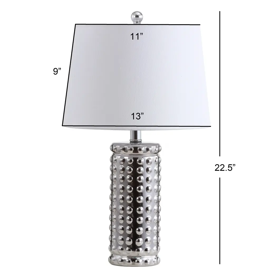 This stylish table lamp is a focal point in the living room, bedroom, or home office. Its sleek chrome body is highlighted by it's dot pattern, adding artistic flair to any contemporary decor.