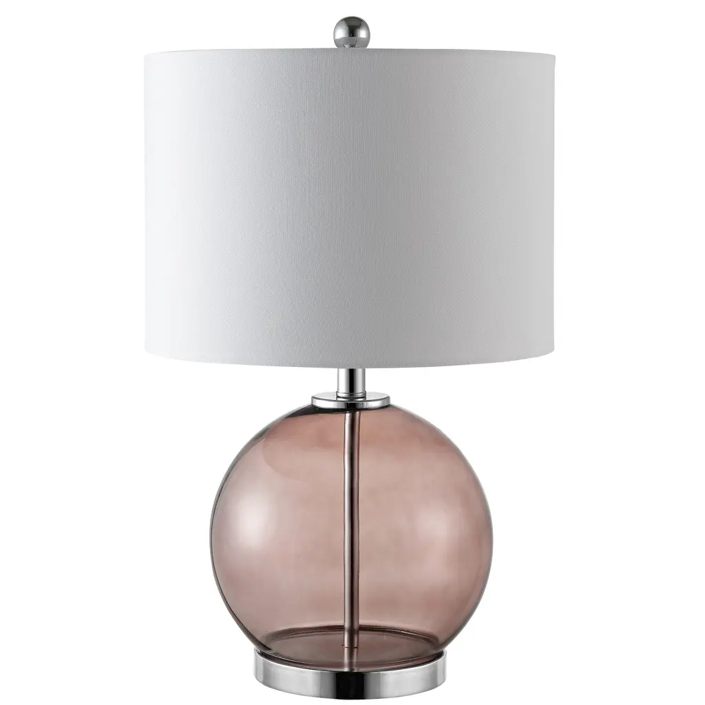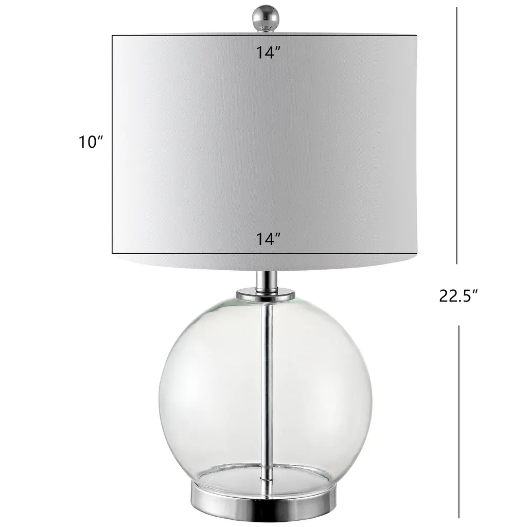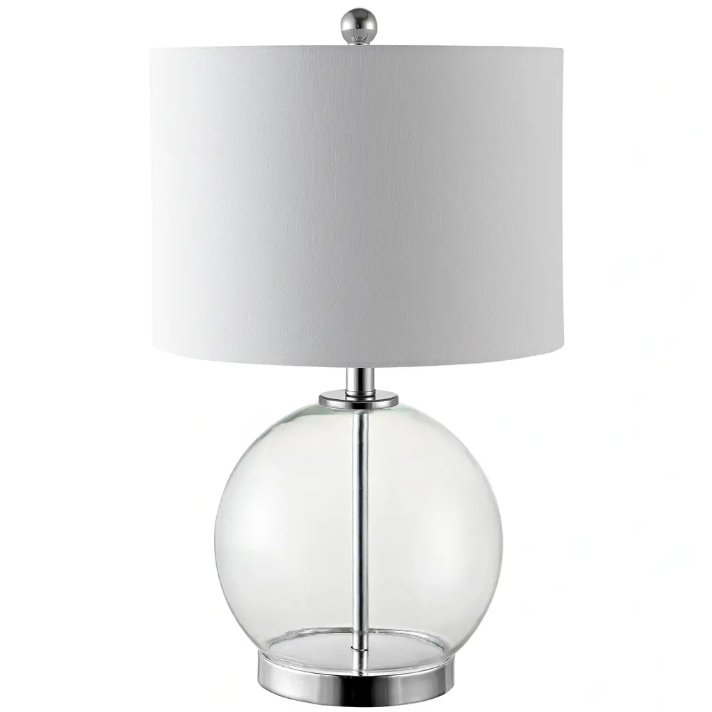 Posh and polished, this contemporary table lamp is versatile and stylish. A new design classic, its sleek glass globe sits on a luxurious shimmering chrome base. Complete with a complimentary matching finial and white shade, it's a designer favorite.