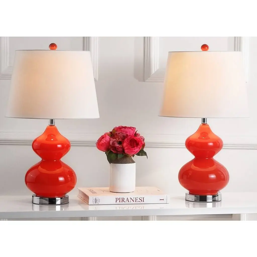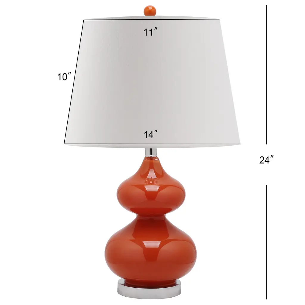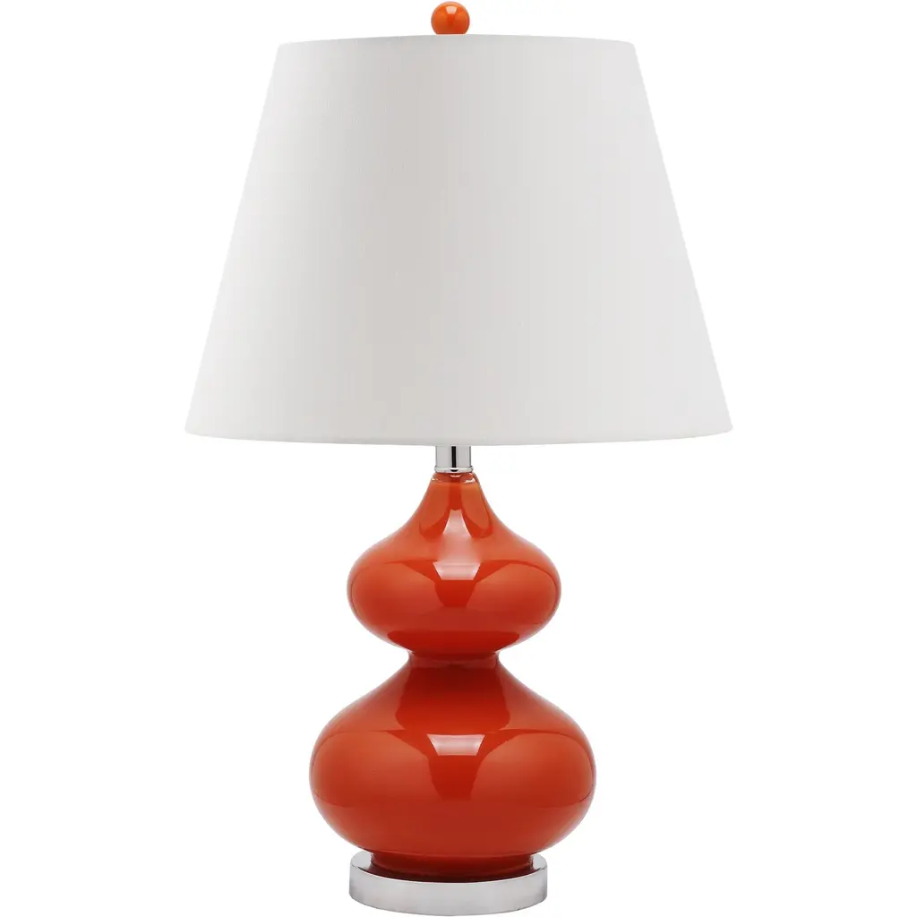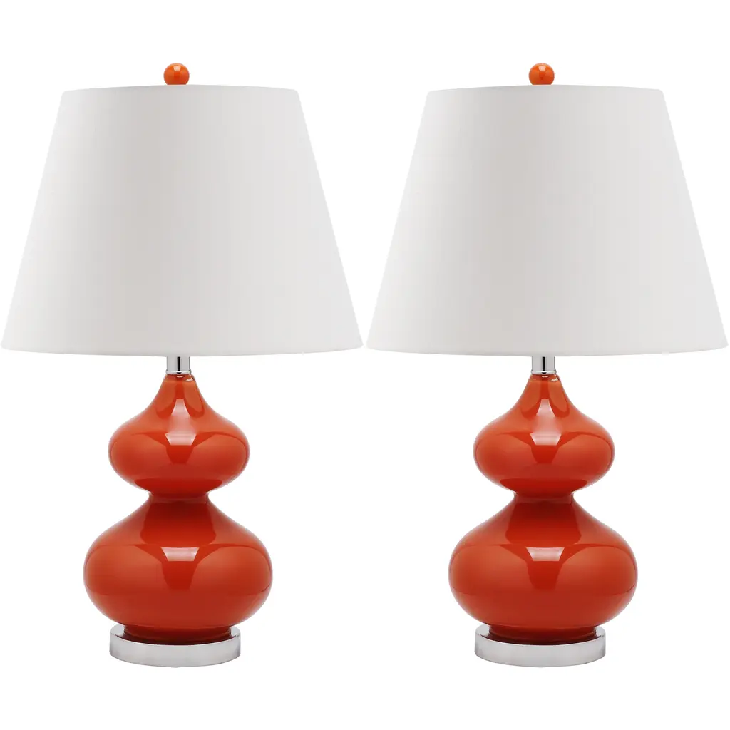 These delightful Eva double-gourd glass lamps by SAFAVIEH add a vibrant, modern touch to any room. Each lamp's appealing rounded body coordinates with its spherical upper finial. Chrome accents and an appealing linen shade contrast beautifully with the light's vibrant orange body. Place the lamps on either side of your sofa, or use them to illuminate your contemporary bedroom.Features:Setting: IndoorFixture finish: OrangeShades: Lighting has a linen cream shadeSocket switchNumber of lights: 1Requires one (1) 100 watt bulb (included)Measures 24 inches high x 14 inches wide x 14 inches deepAssembly required.