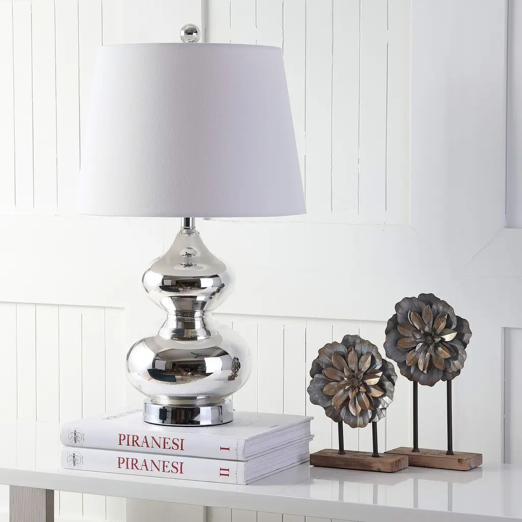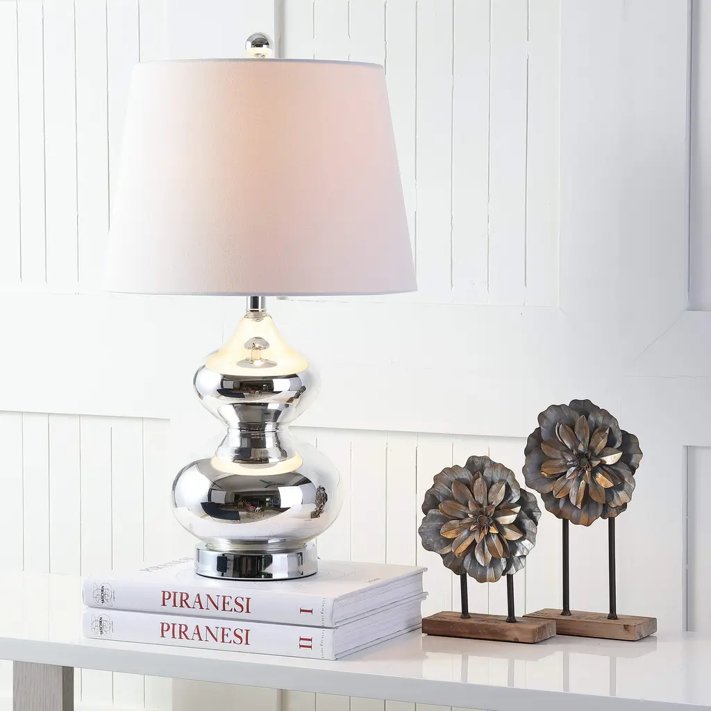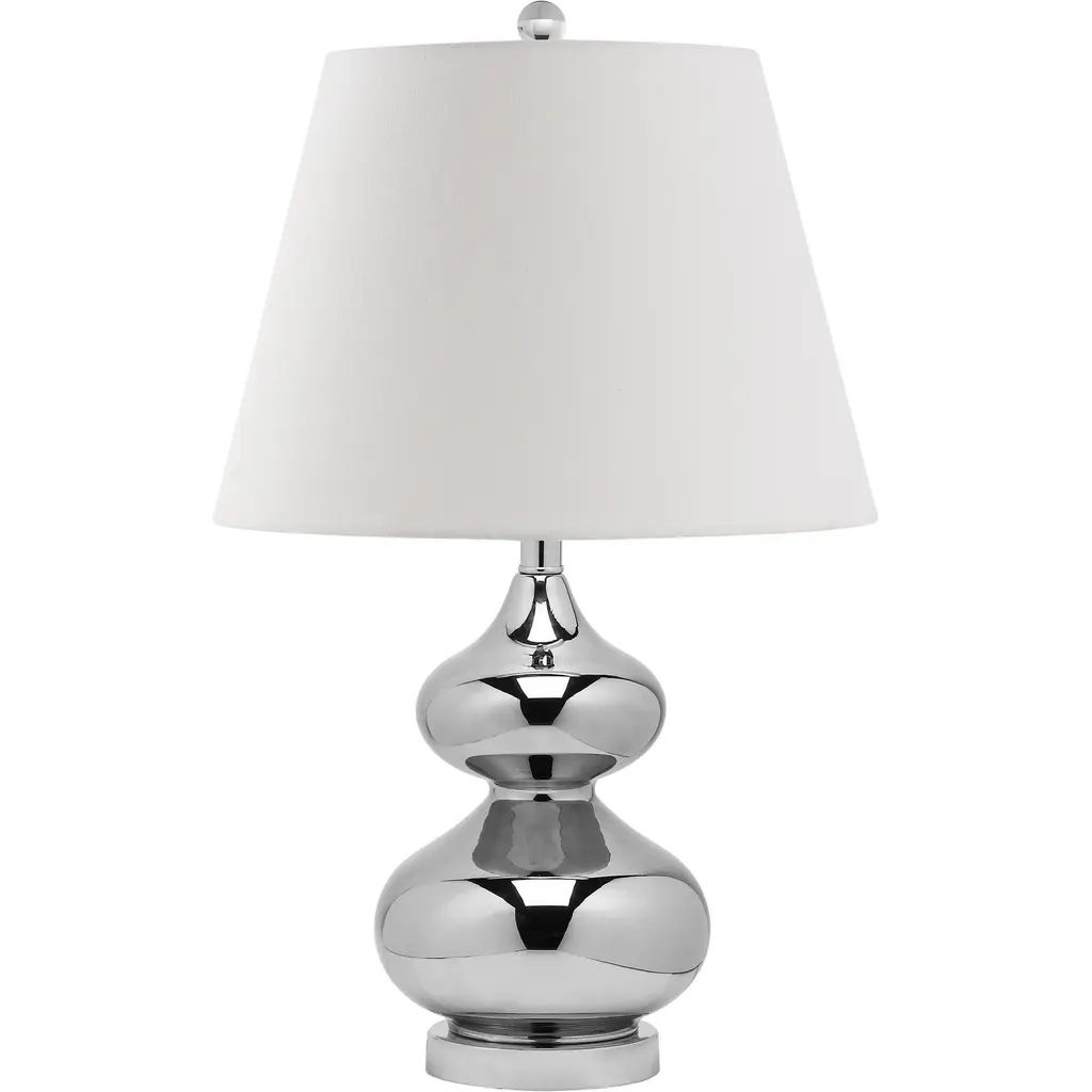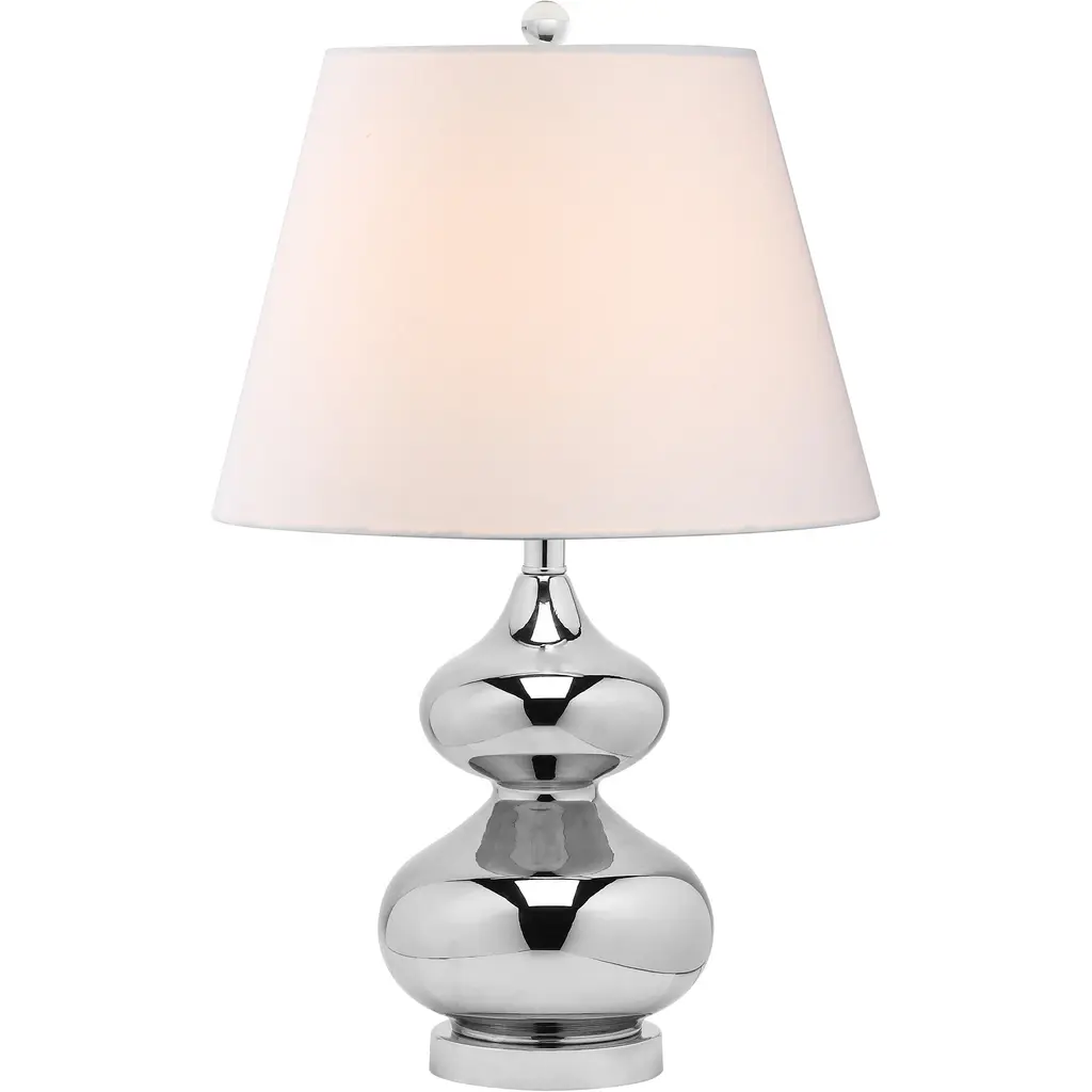 Illuminate your living room, bedroom or family room in style with the shimmery silver double gourd glass lamps with silver finial and brushed silver finish on its metal base and neck. This fashion-right lamp is topped with a contemporary tapered pure linen shade.Features:Setting: IndoorFixture finish: SilverShades: Lighting has a linen cream shadeSocket switchNumber of lights: 1Requires one (1) 100 watt bulb (included)Measures 24 inches high x 14 inches wide x 14 inches deepAssembly required.