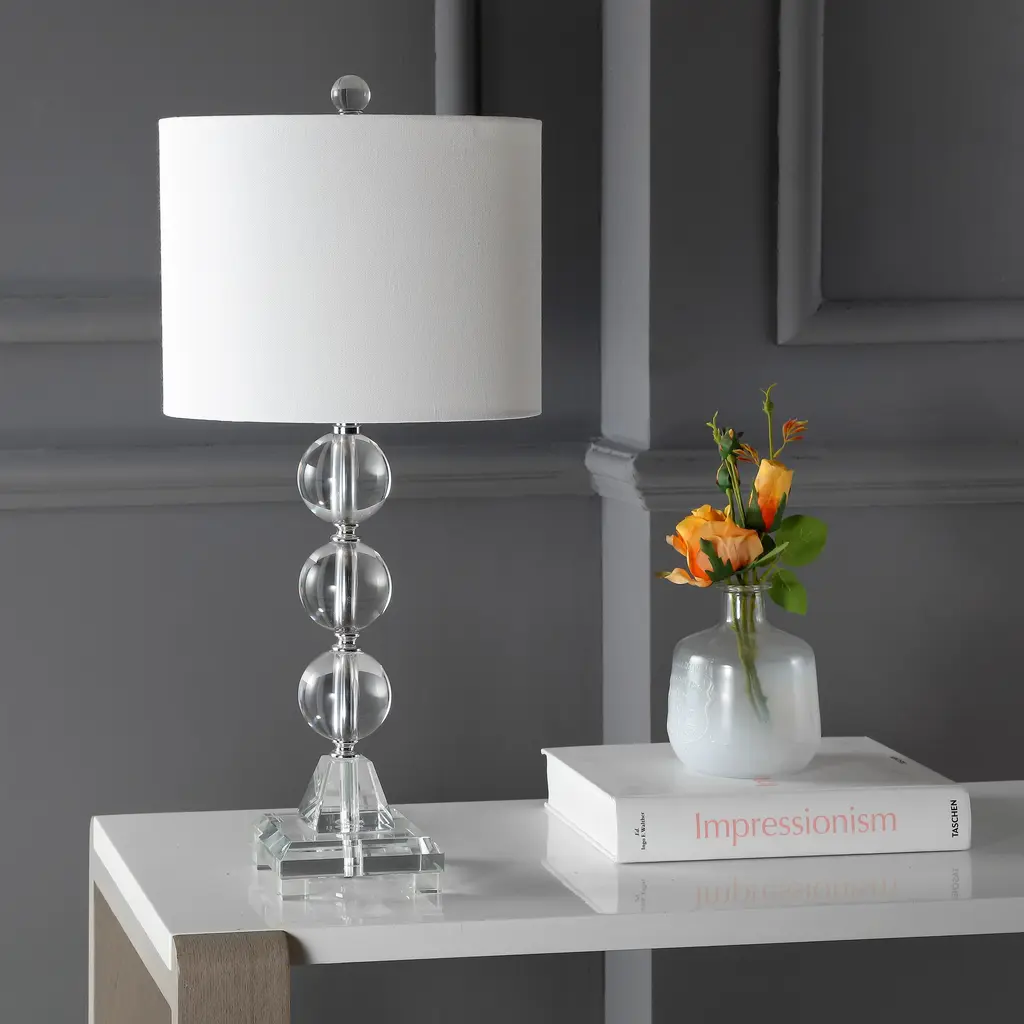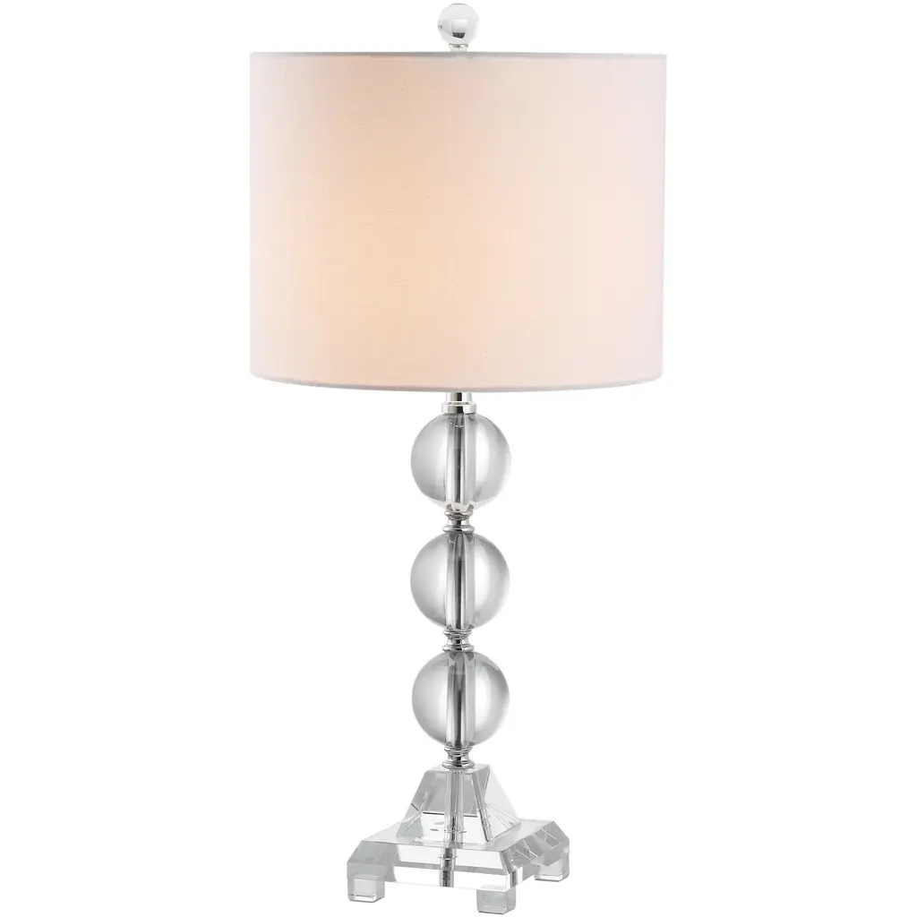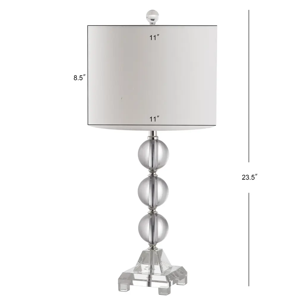 Clearly dramatic, the Fiona stacked crystal ball lamps add transparent beauty to living room, bedroom or hall. With silver platform and fittings and linen-weave white cotton drum shade, this contemporary design will brighten any room in style. Standing a full 23.5-inches tall, these bold table lamps offer an excellent lighting solution to any dark corner or dull area in your home or office. Each lamp requires a 100 watt light bulb for maximum illumination, and the convenient socket switch is easy to turn on and off as needed.Features:Setting: IndoorFixture finish: CrystalShades: Lighting has a linen white shadeSocket switchNumber of lights: 1Requires one (1) 100 watt bulb (included)Measures 23.5 inches high x 11 inches in diameterAssembly required.