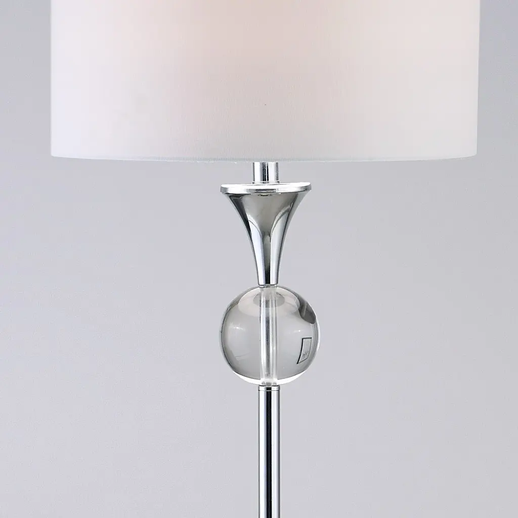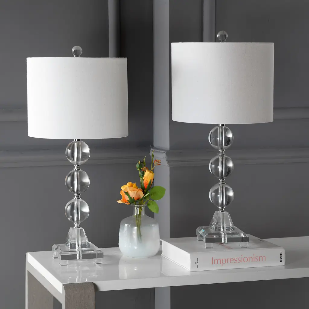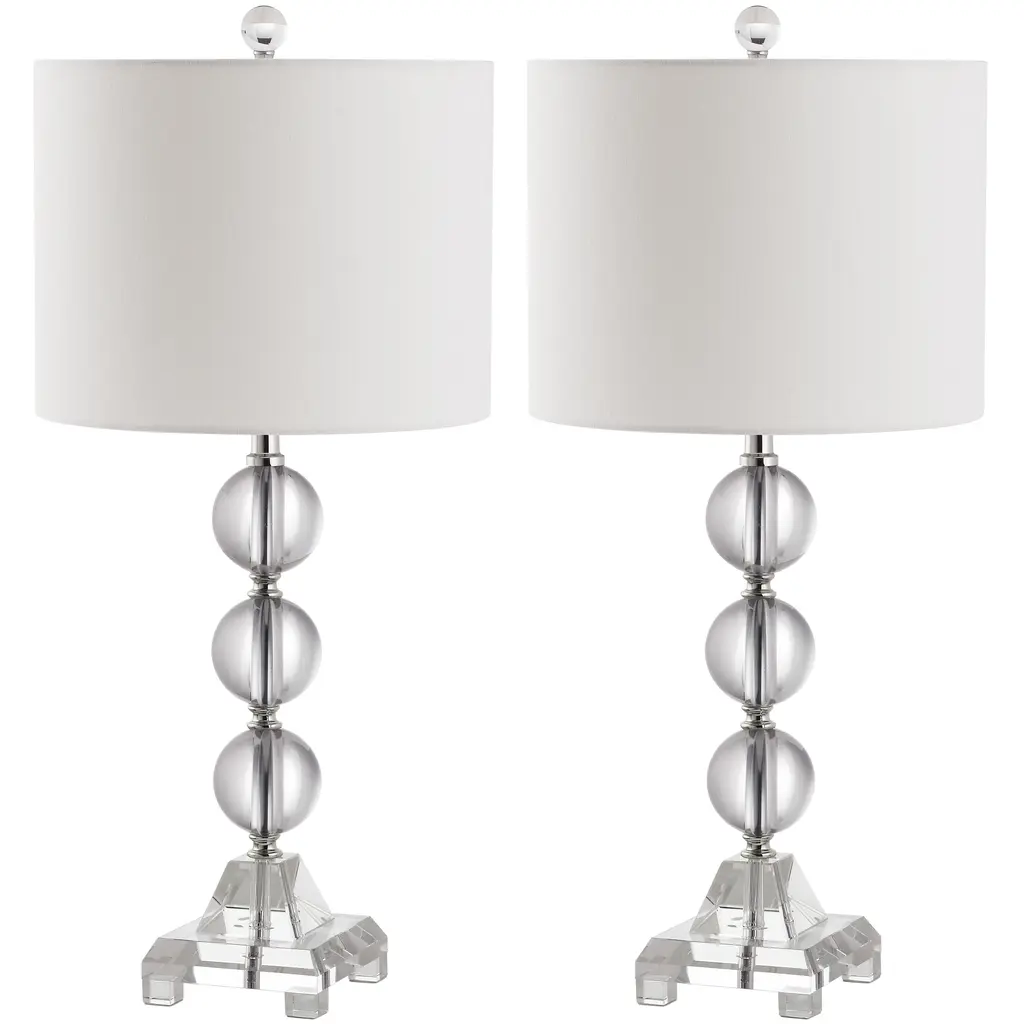 Clearly dramatic, the Fiona stacked crystal ball lamps add transparent beauty to living room, bedroom or hall. With silver platform and fittings and linen-weave white cotton drum shade, this contemporary design will brighten any room in style. Standing a full 23.5-inches tall, these bold table lamps offer an excellent lighting solution to any dark corner or dull area in your home or office. Each lamp requires a 100 watt light bulb for maximum illumination, and the convenient socket switch is easy to turn on and off as needed.Features:Setting: IndoorFixture finish: CrystalShades: Lighting has a linen white shadeSocket switchNumber of lights: 1Requires one (1) 100 watt bulb (included)Measures 23.5 inches high x 11 inches in diameterAssembly required.