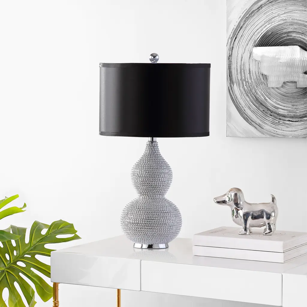 Bring some retro art deco style to your contemporary bedroom or living room with this set of silver-beaded lamps. The black satin drum shades perfectly offset the brilliant sparkles of the curved bases, creating illuminated works of art just right for brightening a room that's too plain or austere. Place these lamps on your contemporary bedroom's nightstands, or use them at either end of a black leather couch to make a dramatic statement.Features:Setting: IndoorFixture finish: ResinShades: Lighting has a black satin shadeSocket switchNumber of lights: 1Requires one (1) 100 watt bulb (included)Measures 24 inches high x 14 inches wide x 14 inches deepAssembly required