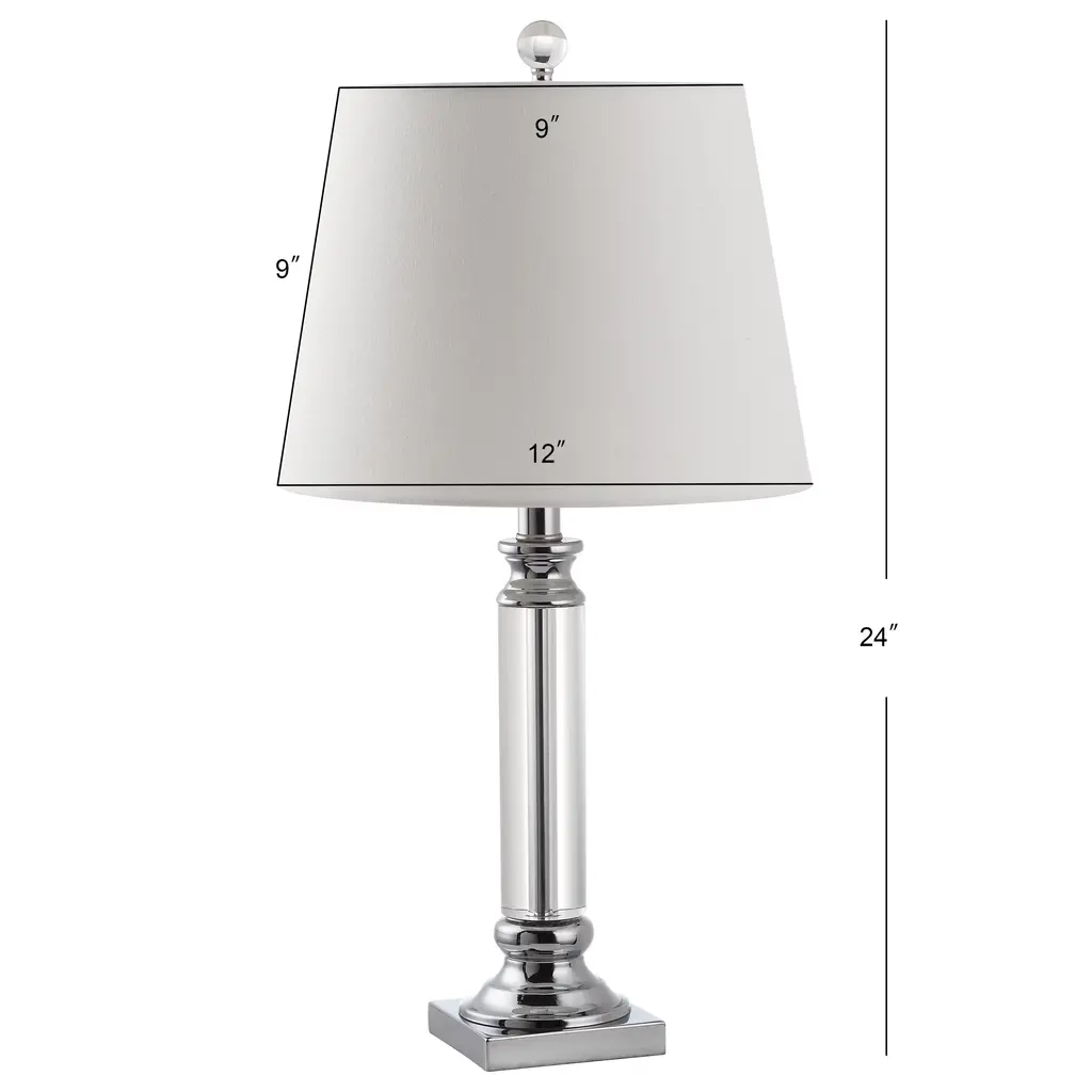 Classic pillar lamps fashioned after elegant crystal candlesticks, Zara are a study in mixed media. With stepped silver base and architectural detailing, the Zara crystal table lamps are topped bay slightly tapered white cotton bell shade in linen weave.Features:Setting: IndoorFixture finish: CrystalShades: Lighting has a linen white shadeSocket switchNumber of lights: 1Requires one (1) 100 watt bulb (included)Measures 23 inches high x 12 inches in diameterBase dimensions: 4.75 inches wide x 4.75 inches long x 1 inch highAssembly required.