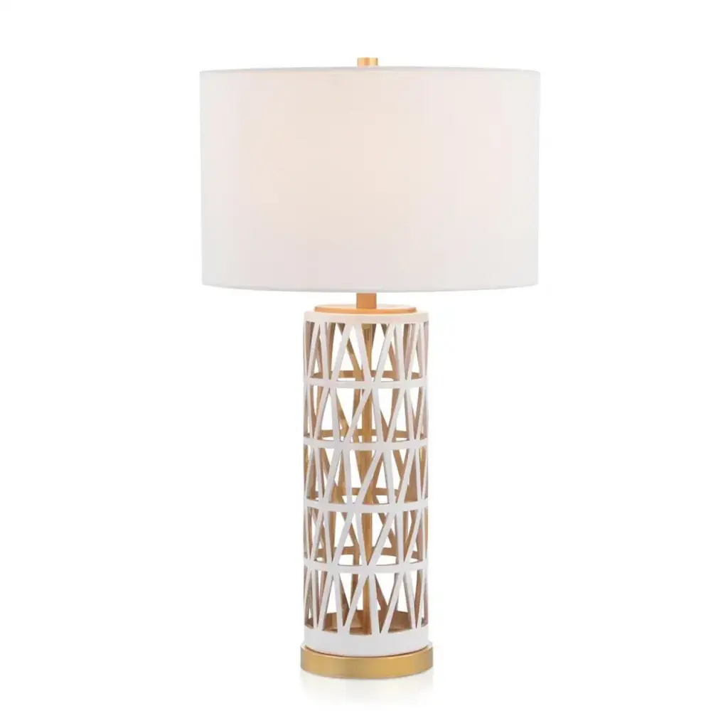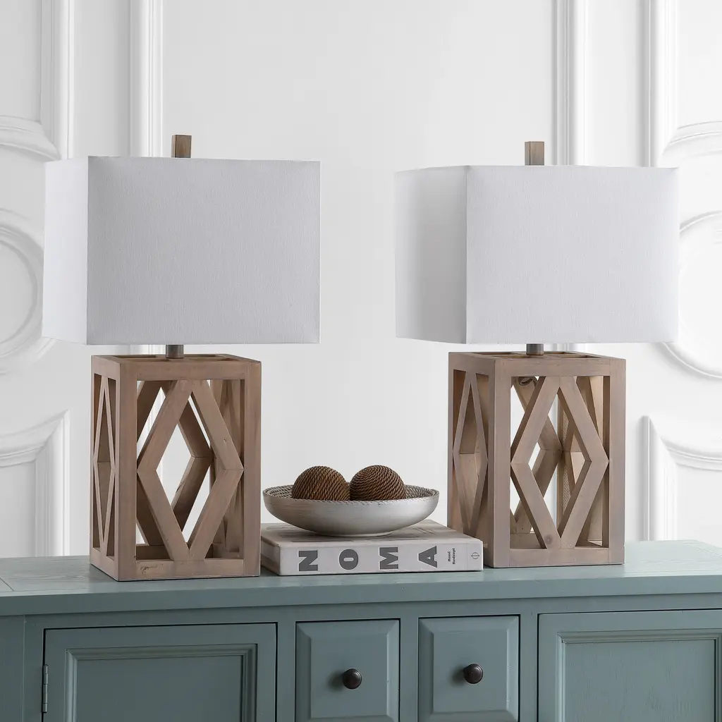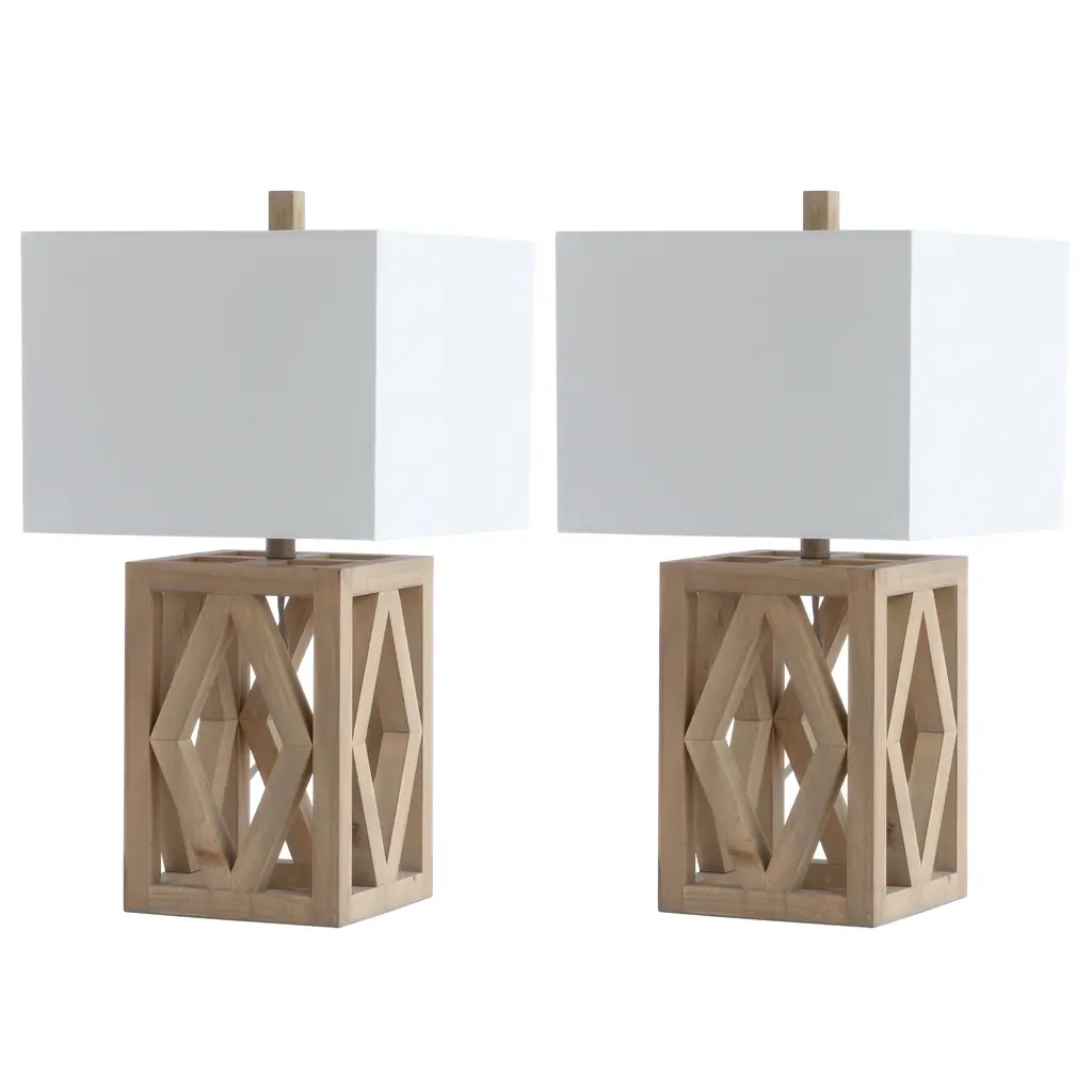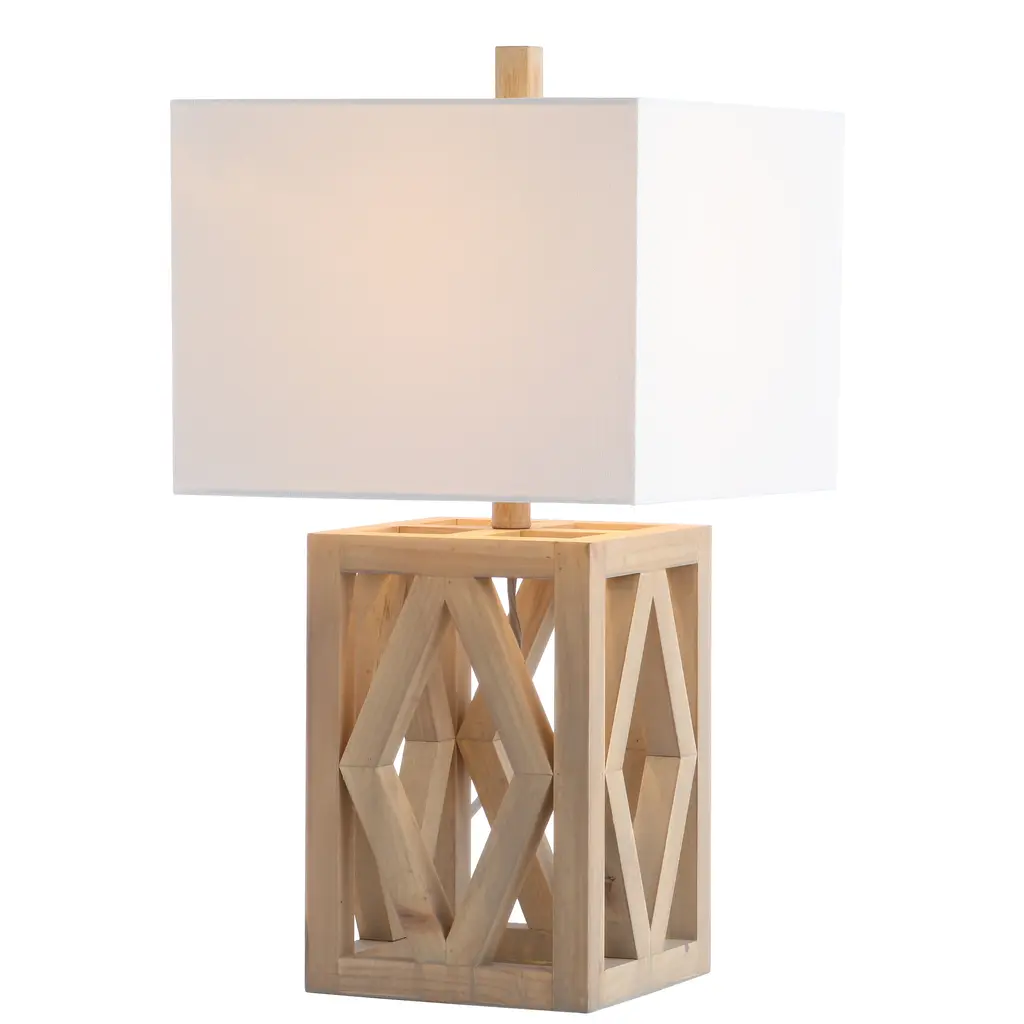 Make a bold statement in any living room with the geometric lines of this contemporary table lamp. Its fine wood craftsmanship is illuminated by the soft glow of a complimentary off-white 100% cotton rectangular shade held in place by its matching finial.