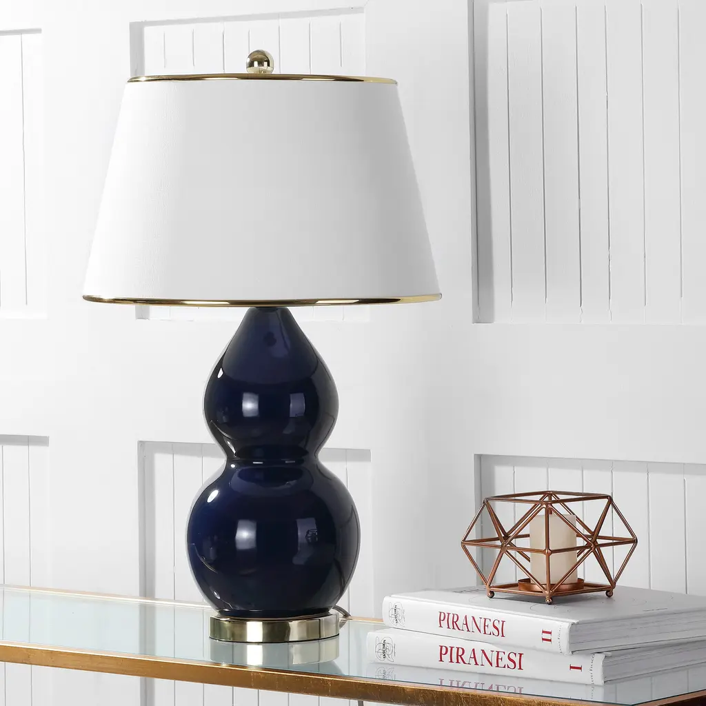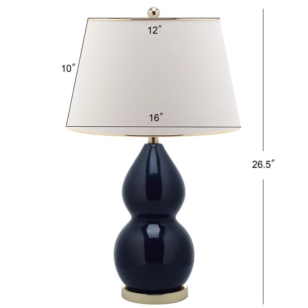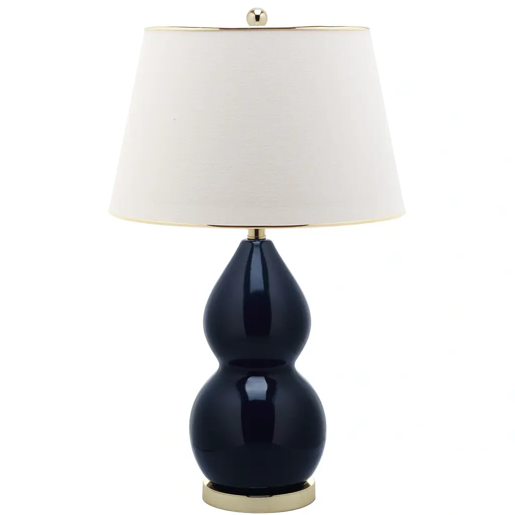 Graphic and contemporary, the Zoey double gourd lamps pull off style and grace featuring gold trim base and rims on the shades. SAFAVIEH completely updates this timeless design with this porcelain two-gourd form with the striking solids in chic fashion shade of navy.Features:Fixture finish: NavyShades: Lighting has a linen white with gold trim shadeSocket switchNumber of lights: 1Requires One (1) 100 watt bulb (included)Measures 25.5 inches high x 16 inches wide x 16 inches deepAssembly required.