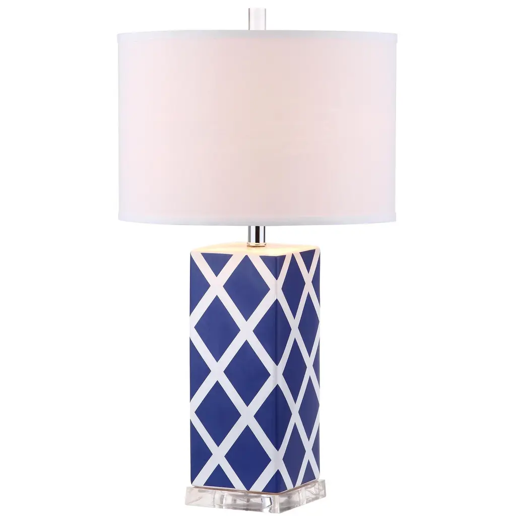 Forever plaid takes on new meaning with the Garden Lattice table lamp by SAFAVIEH. Crafted of navy and white ceramic with acrylic base and a silver neck, this graphic windowpane design is topped with a contemporary white cotton hardback drum shade.Features:Number of Light: 1 LightShade Material: Cotton ThreadBulb Wattage: 100 WLighting Type: Table LampLamp Type: Table LampCrafted of Ceramic, AcrylicHeight: 23 in or moreWidth: 16 in or lessLumens: 800Setting: IndoorSwitch Type: On-Off Rotary SwitchLighting Style: ContemporaryFinish: Silver FinishColor: BlueMeasures 15 inches wide x 15 inches deep x 27 inches high> - SAFAVIEH highest quality and unmatched style