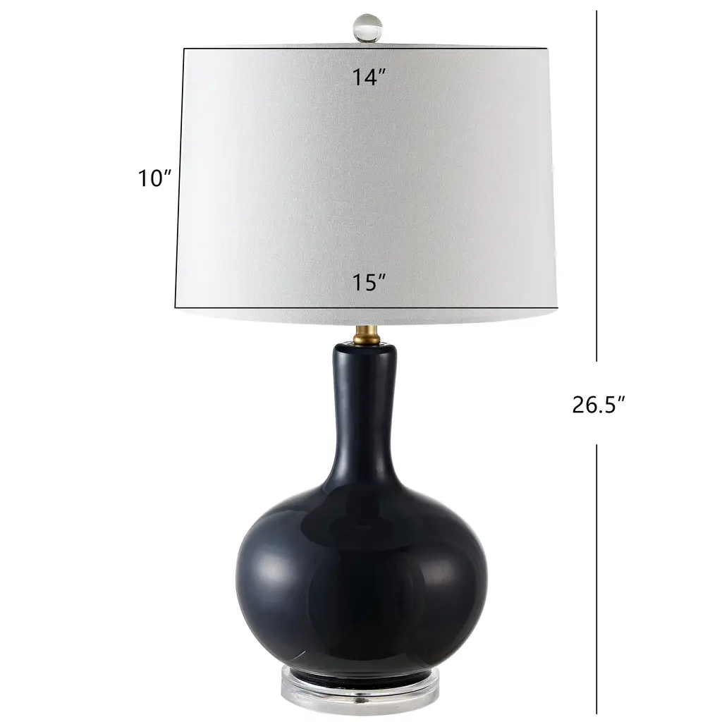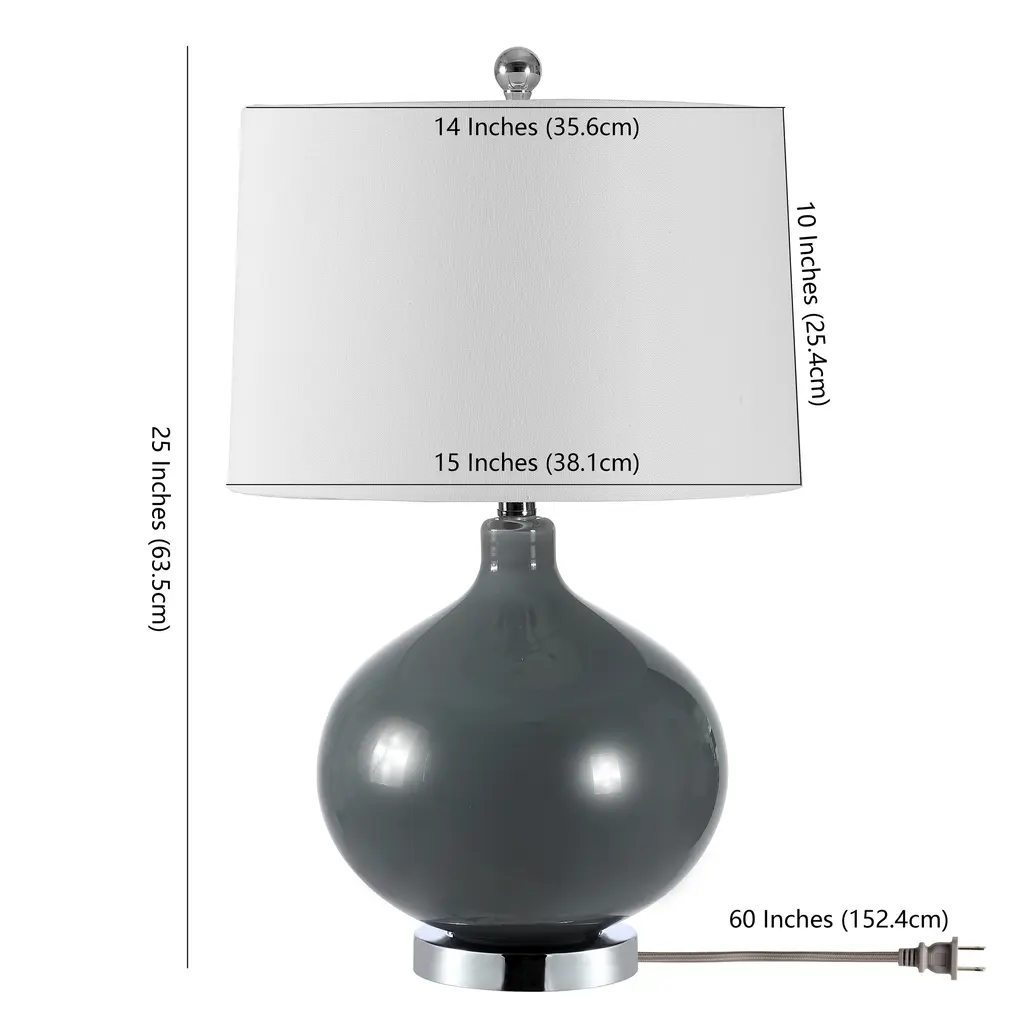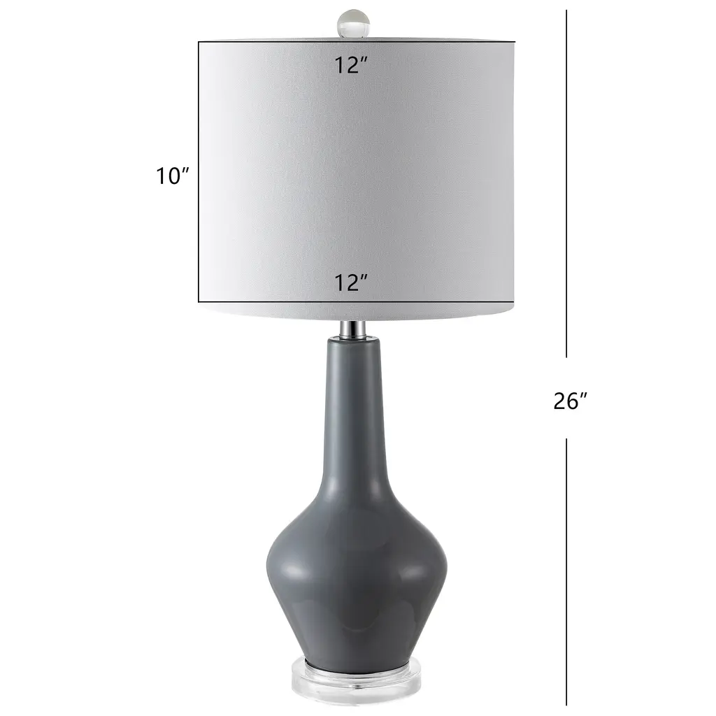 Bring modern magic to any contemporary interior with this stunning genie-style table lamp. Designed with a luxurious hue that illuminates its sleek glass curves, it sits on an acrylic base and is topped with a matching finial and white shade.