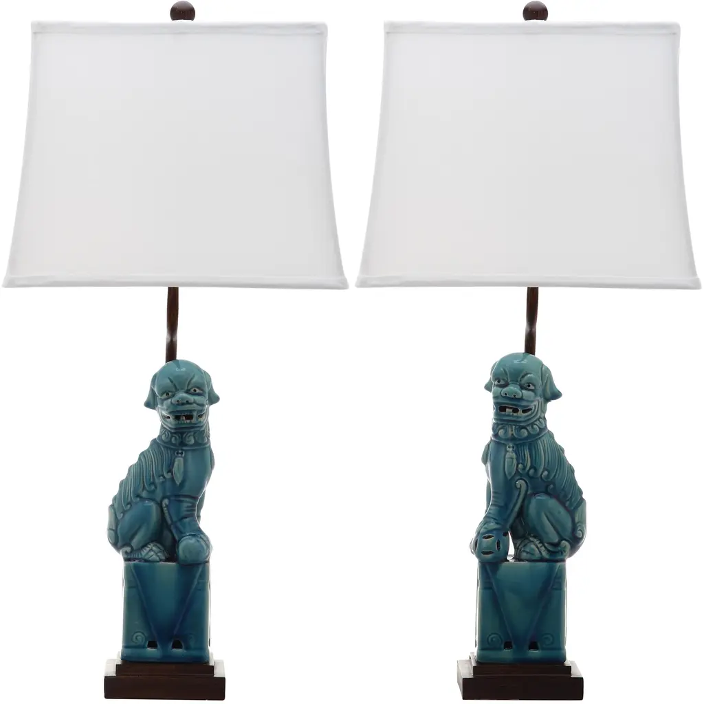 With a nod to the Far East, these stately Foo Dog table lamps add a worldly touch to any room. Crafted of blue ceramic with pure cotton shade and contrasting brown stand and fittings, this centuries-old design is refreshed with chic fashion colors.Features:Setting: IndoorFixture finish: BlueIncludes: Two (2) lampsShades: Lighting has a white cotton shadeSocket switchNumber of lights: 1Requires one (1) 100-watt bulb (included)Measures 28 inches high x 14 inches wide x 9 inches deepAssembly required.