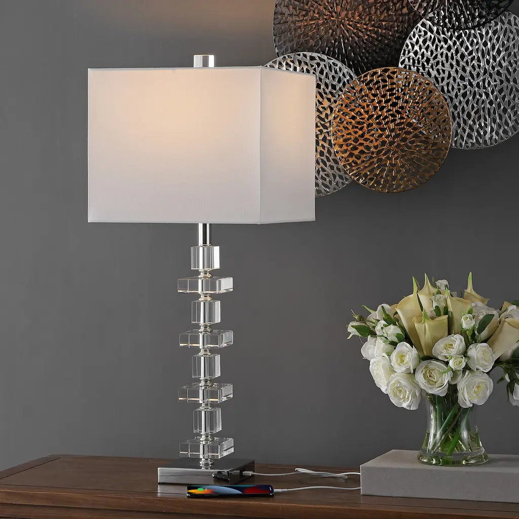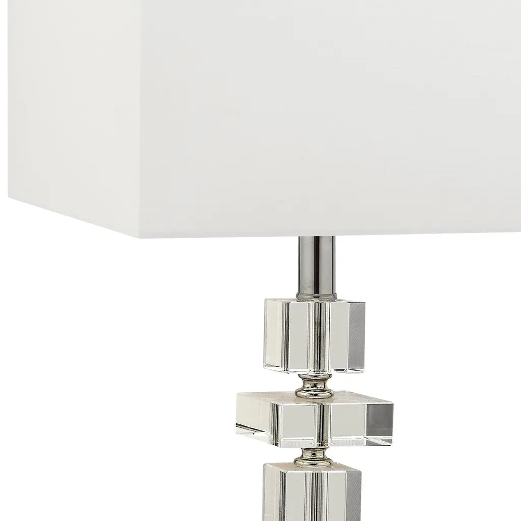 Alternating large and small blocks of solid crystal create a dramatic statement in this set of two Deco Crystal table lamps. With chrome fittings and contemporary rectangular cotton shade, graphic geometric forms recall the glamour of Art Deco style.Features:Setting: IndoorFixture finish: CrystalIncludes: Two (2) lampsShades: Lighting has a white cotton shadeSocket switchNumber of lights: 1Requires one (1) 100-watt bulb (included)Measures 28 inches high x 12 inches wide x 12 inches deepAssembly required