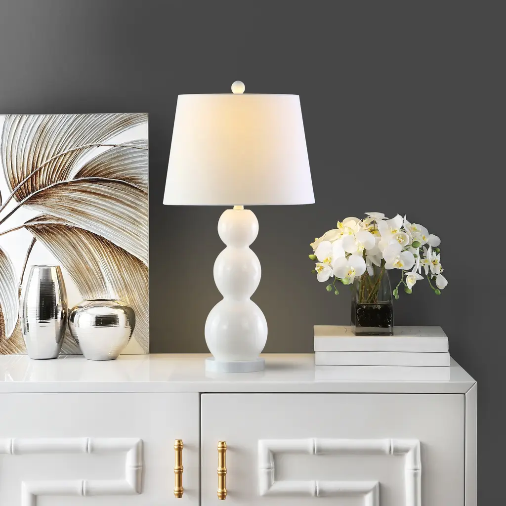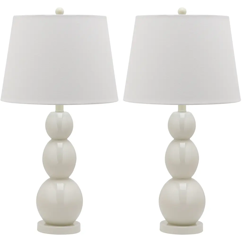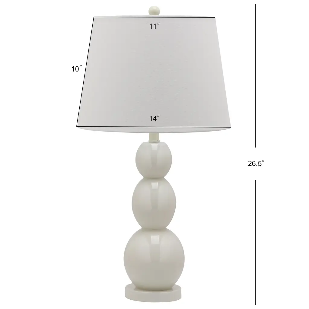 A perfect balance of form and function, this set of graceful lamps features three shiny white glass balls that graduate in size. With matching white fittings, and a slightly tapered linen shade, the stacked sphere glass lamp adapts beautifully to any setting.Features:Setting: IndoorFixture finish: WhiteShades: Lighting has a linen cream shadeSocket switchNumber of lights: 1Requires one (1) 100 watt bulb (included)Measures 27.5 inches high x 14 inches wide x 14 inches deepAssembly required.