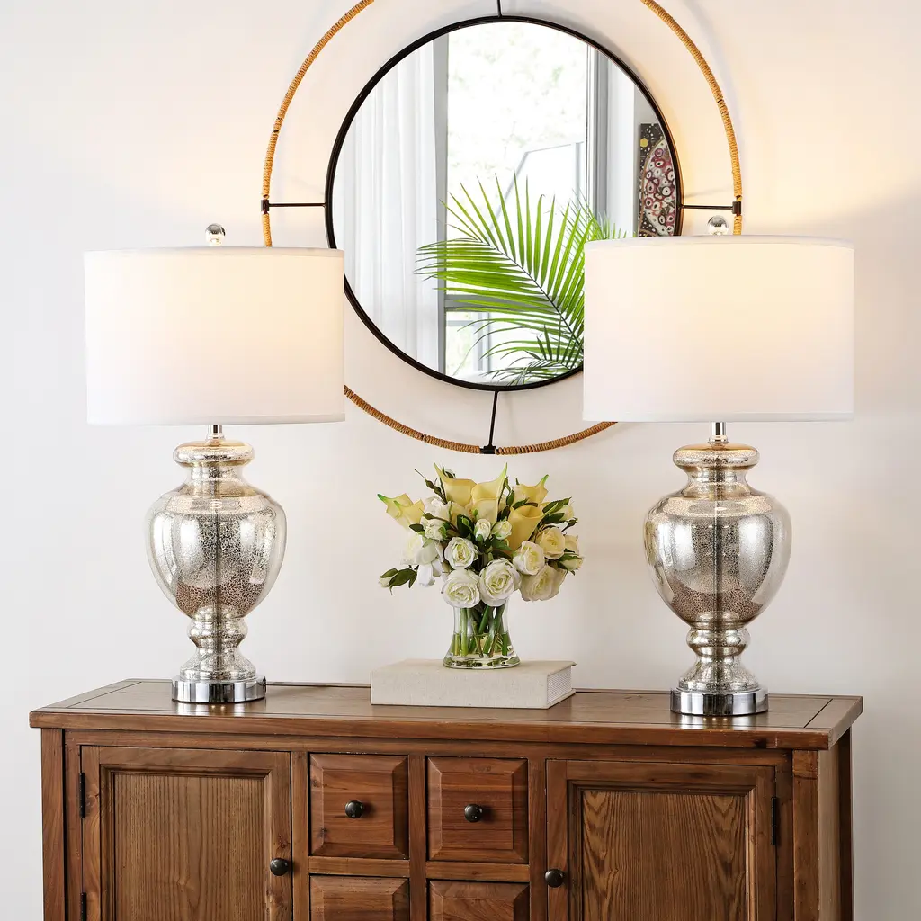 Brighten up any room with the turquoise glass on this set of two table lamps. With a 100-watt light bulb, these table lamps emit a bright light suitable for reading, writing and other tasks that require good light. A white cotton shade and steel finish add contrast to the turquoise glass. Use these lamps on a bedside table, side table or any area needing some extra light and color.Features:Setting: IndoorFixture finish: Turquoise glassShades: Lighting has a white cotton shadeSocket switchNumber of lights: 1Requires one (1) 100 watt bulb (included)Measures 28 inches high x 15 inches wide x 15 inches deepAssembly required