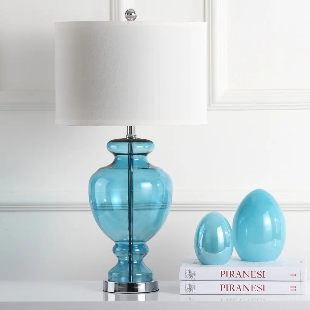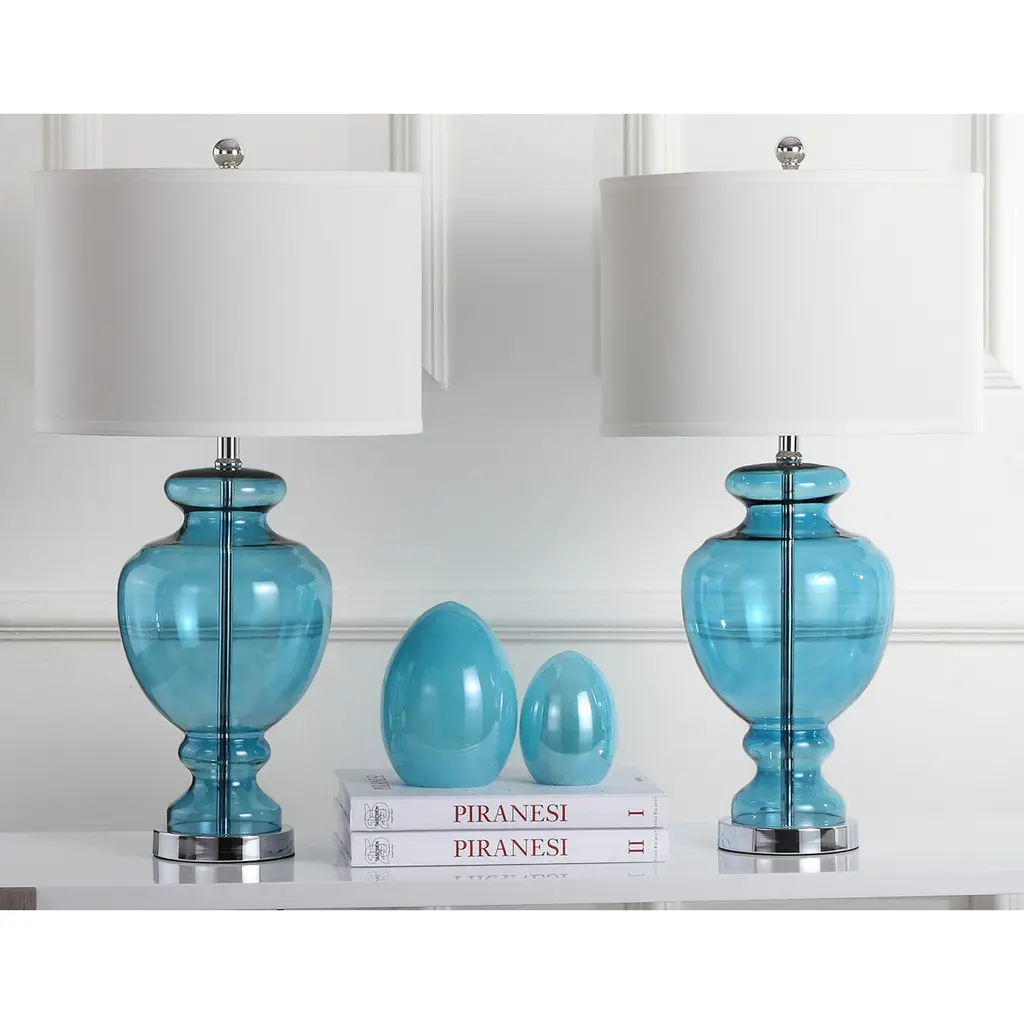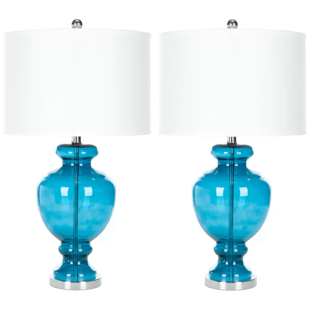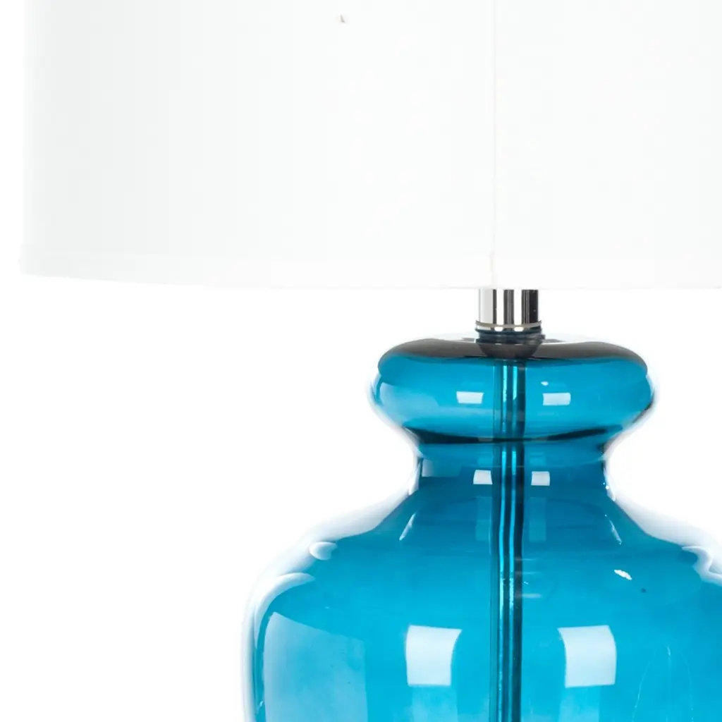 Brighten up any room with the turquoise glass on this set of two table lamps. With a 100-watt light bulb, these table lamps emit a bright light suitable for reading, writing and other tasks that require good light. A white cotton shade and steel finish add contrast to the turquoise glass. Use these lamps on a bedside table, side table or any area needing some extra light and color.Features:Setting: IndoorFixture finish: Turquoise glassShades: Lighting has a white cotton shadeSocket switchNumber of lights: 1Requires one (1) 100 watt bulb (included)Measures 28 inches high x 15 inches wide x 15 inches deepAssembly required