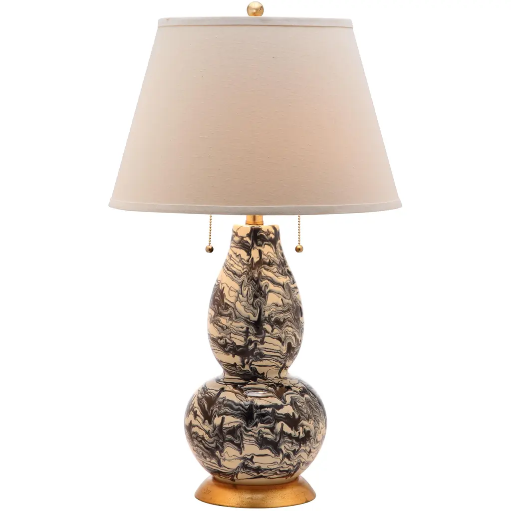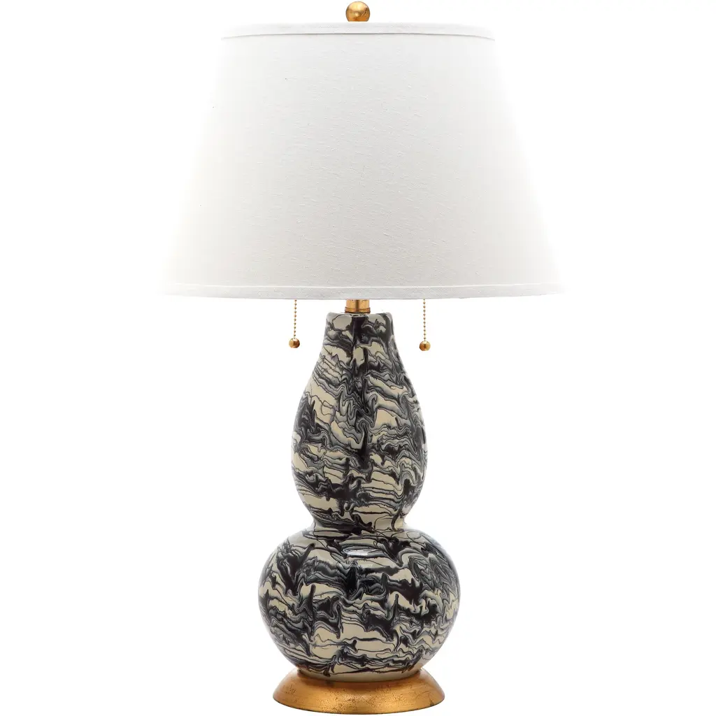 Dress up your home with the designer look of marble recreated in the elegant black and white Color Swirls glass table lamp. Crafted of glass artfully painted in a marbleized effect, this set of lamps is accented with gold fittings and crisp cotton shade.Features:Black and white finishSet includes 2 lampsLighting has a white cotton shadeSocket switchRequires One (1) 100-watt bulb (included)28.5 inches high x 17 inches wide x 17 inches deep