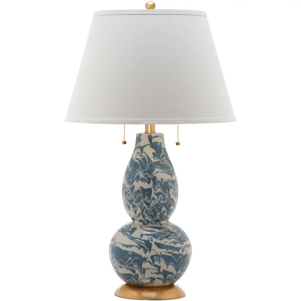 Dress up your home with the designer look of marble recreated in the elegant blue and white Color Swirls glass table lamp. Crafted of glass artfully painted in a marbleized effect, this set of lamps is accented with gold fittings and crisp cotton shade.Features:Number of Light: 1 LightShade Material: Cotton ThreadBulb Wattage: 100 WLighting Type: Table LampLamp Type: Table LampCrafted of GlassHeight: 23 in or moreWidth: 16 in or lessLumens: 800Setting: IndoorSwitch Type: On-Off Rotary SwitchLighting Style: ContemporaryFinish: Goldtone FinishColor: Blue