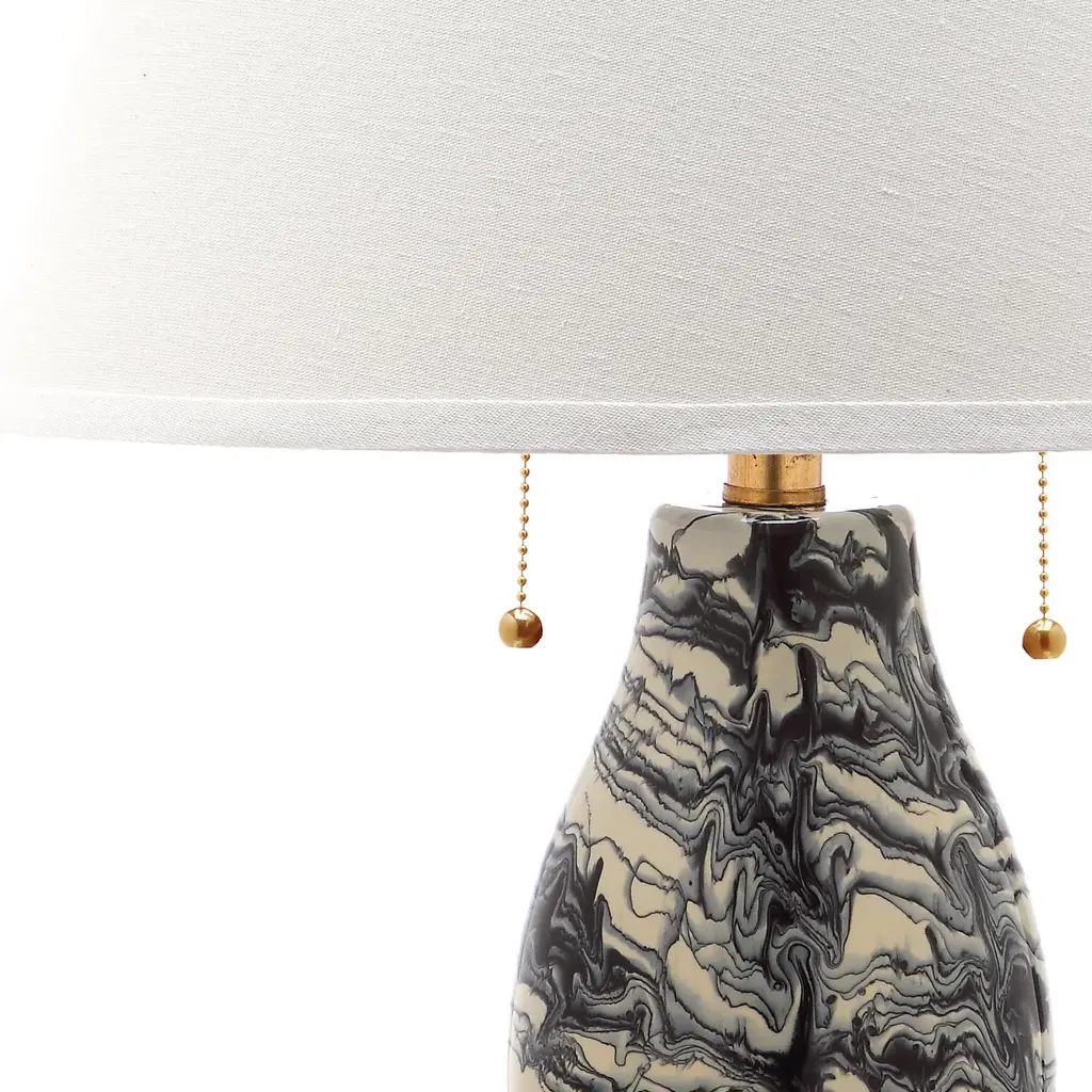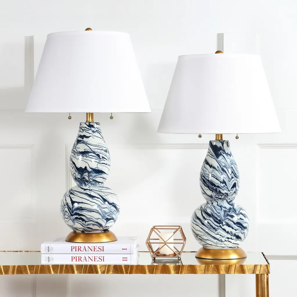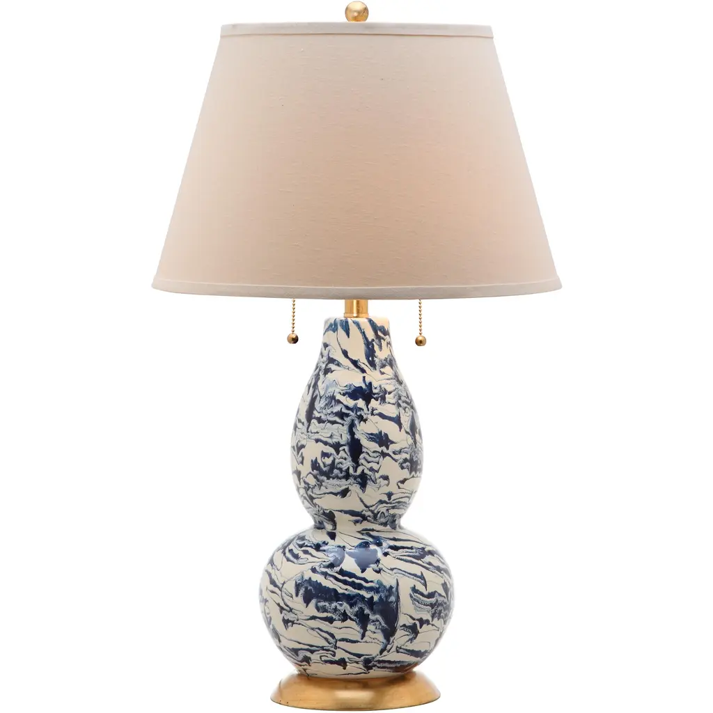 Dress up your home with the designer look of marble recreated in the elegant navy and white Color Swirls glass table lamp. Crafted of glass artfully painted in a marbleized effect, this set of lamps is accented with gold fittings and crisp cotton shade.Features:Setting: IndoorFixture finish: Navy and WhiteIncludes: Two (2) lampsShades: Lighting has a white cotton shadeSocket switchNumber of lights: 1Requires one (1) 100-watt bulb (included)Measures 28.5 inches high x 17 inches wide x 17 inches deepAssembly required.