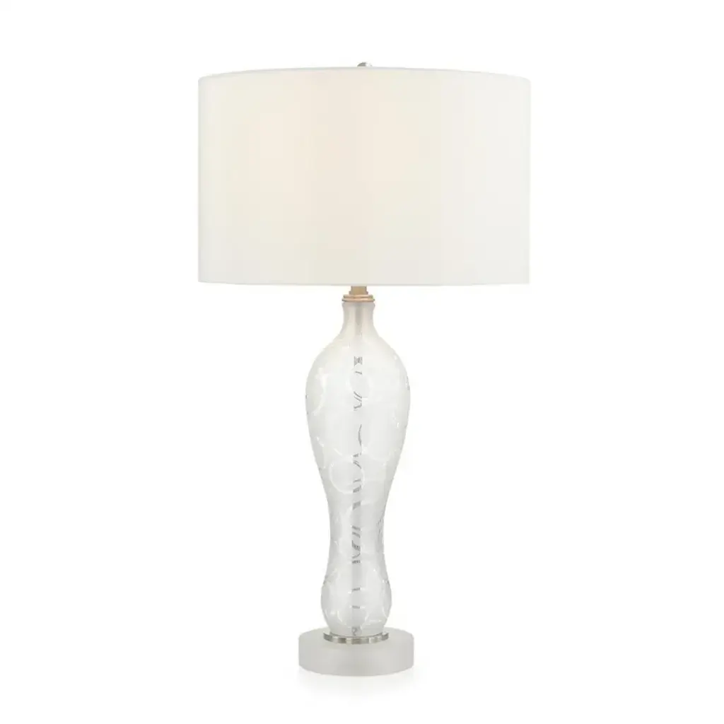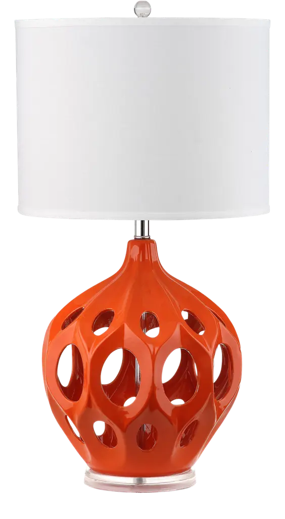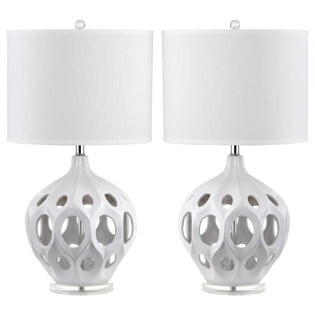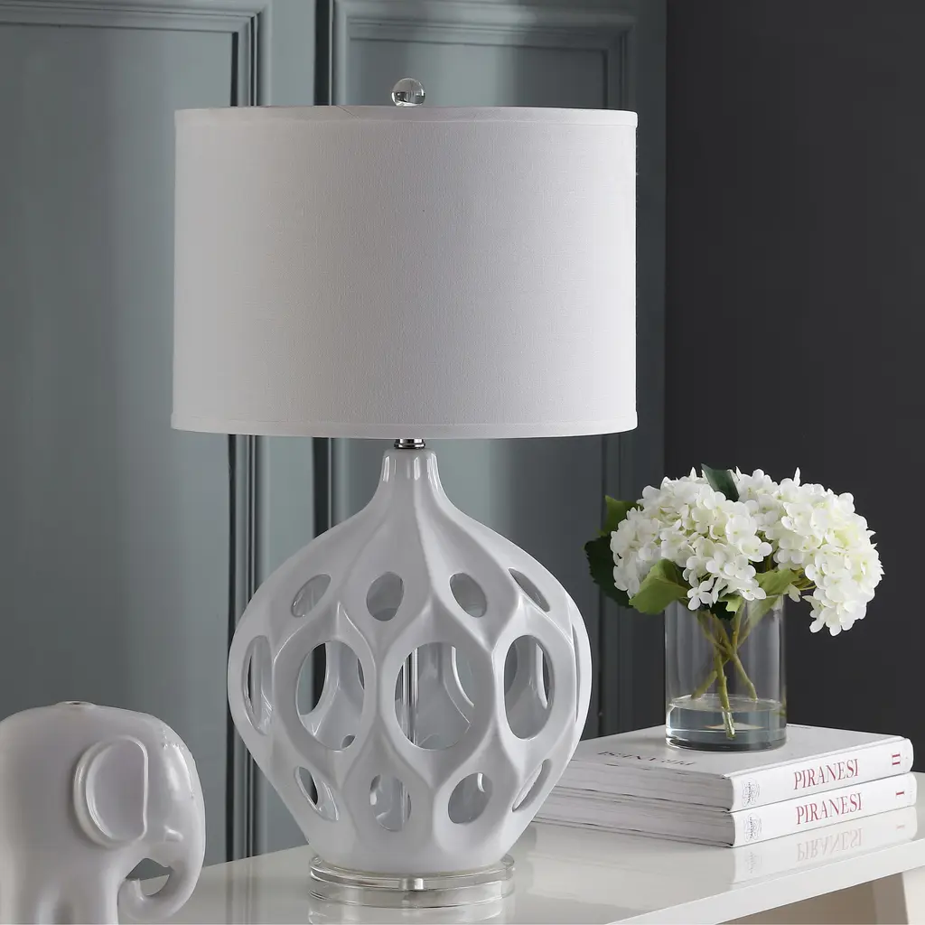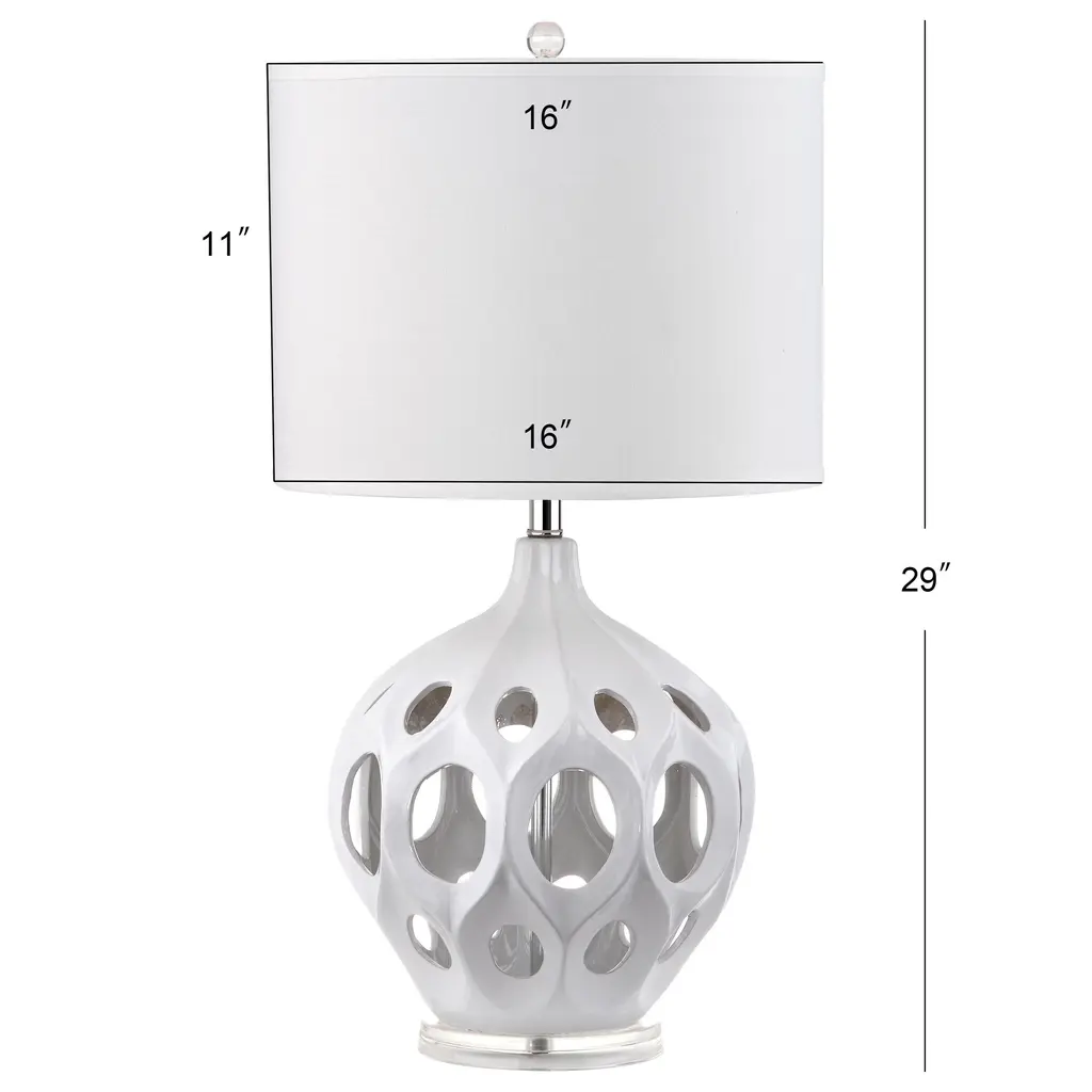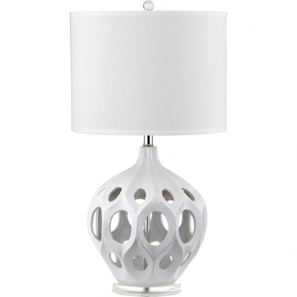An intriguing sculptural design with open cutouts, the pure white Regina ceramic table lamp by SAFAVIEH is a fresh take on the traditional gourd lamp. A crisp white cotton hardback drum shade and silver fittings lend a transitional vibe to any interior style Features:Setting: IndoorFixture finish: WhiteIncludes: One (1) lampShades: Lighting has a white polyester shadeSocket switchNumber of lights: 1Requires one (1) 100-watt bulb (included)Measures 29 inches high x 16 inches wide x 16 inches deepAssembly required