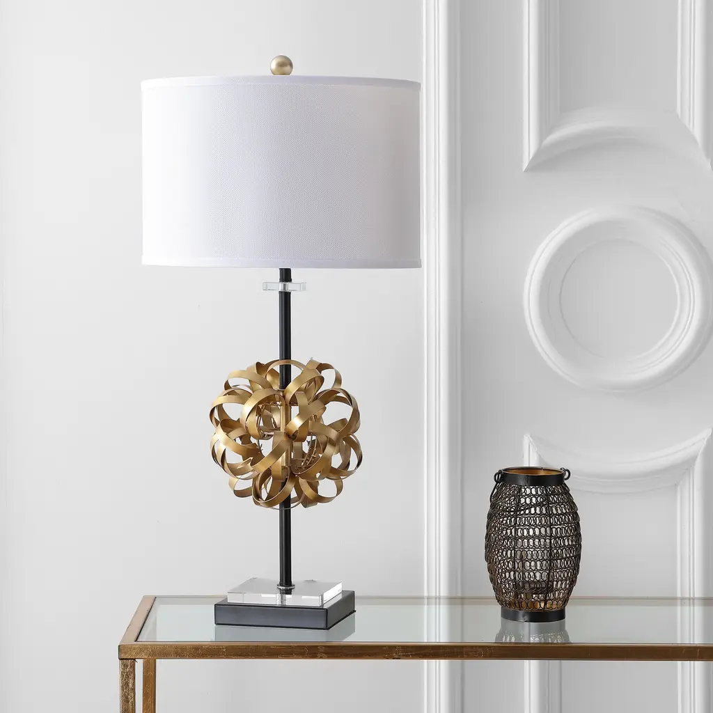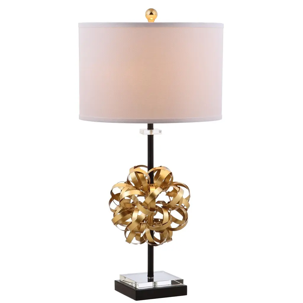 Bring luxe style to any interior with this sleek 30-inch table lamp. Artfully designed, its whimsical, gold sculpture and smooth crystal base add deluxe contemporary style to the living room, entryway or hall.