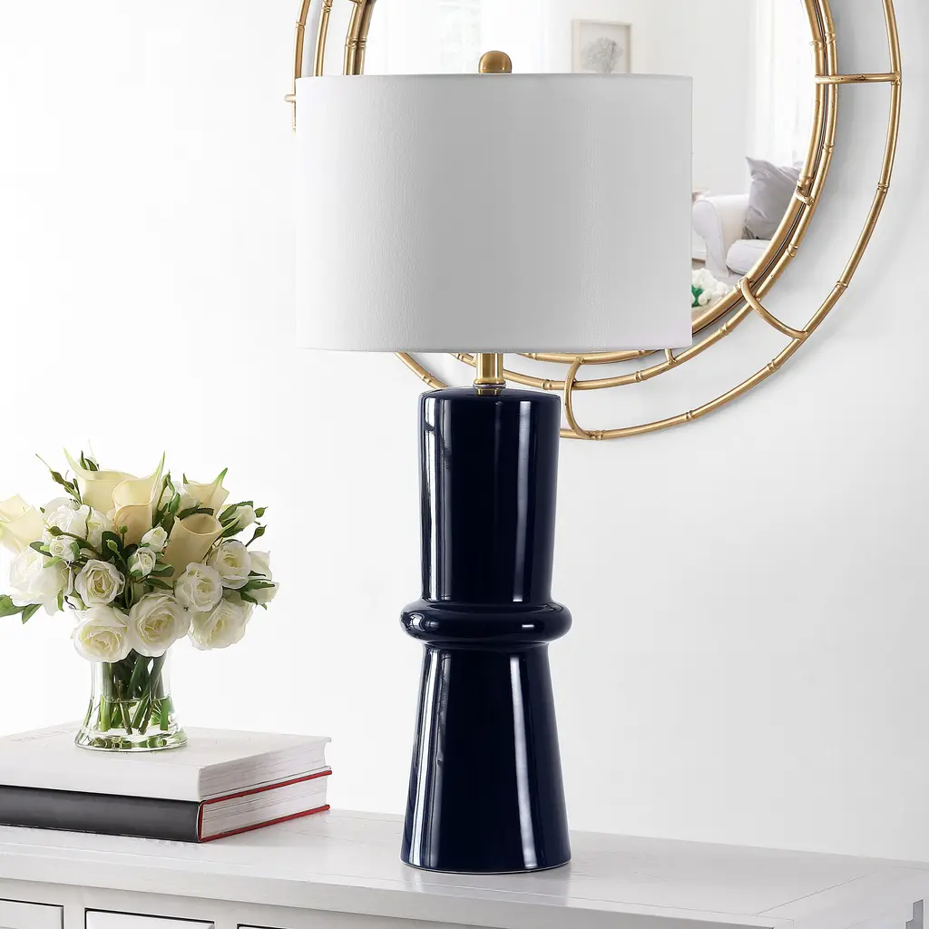 A modern interpretation of the classic candlestick light, this Ellaria Table Lamp shines in any décor. Ellaria's straightforward geometric silhouette is given additional intrigue with a raised central band, and a rich navy finish brings a splash of color to neutral-toned furnishings. Sold in sets of two.