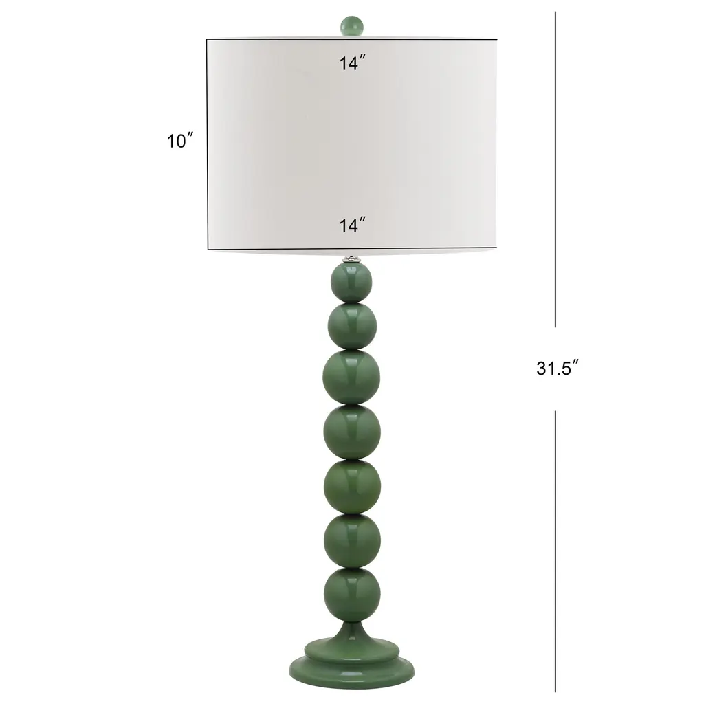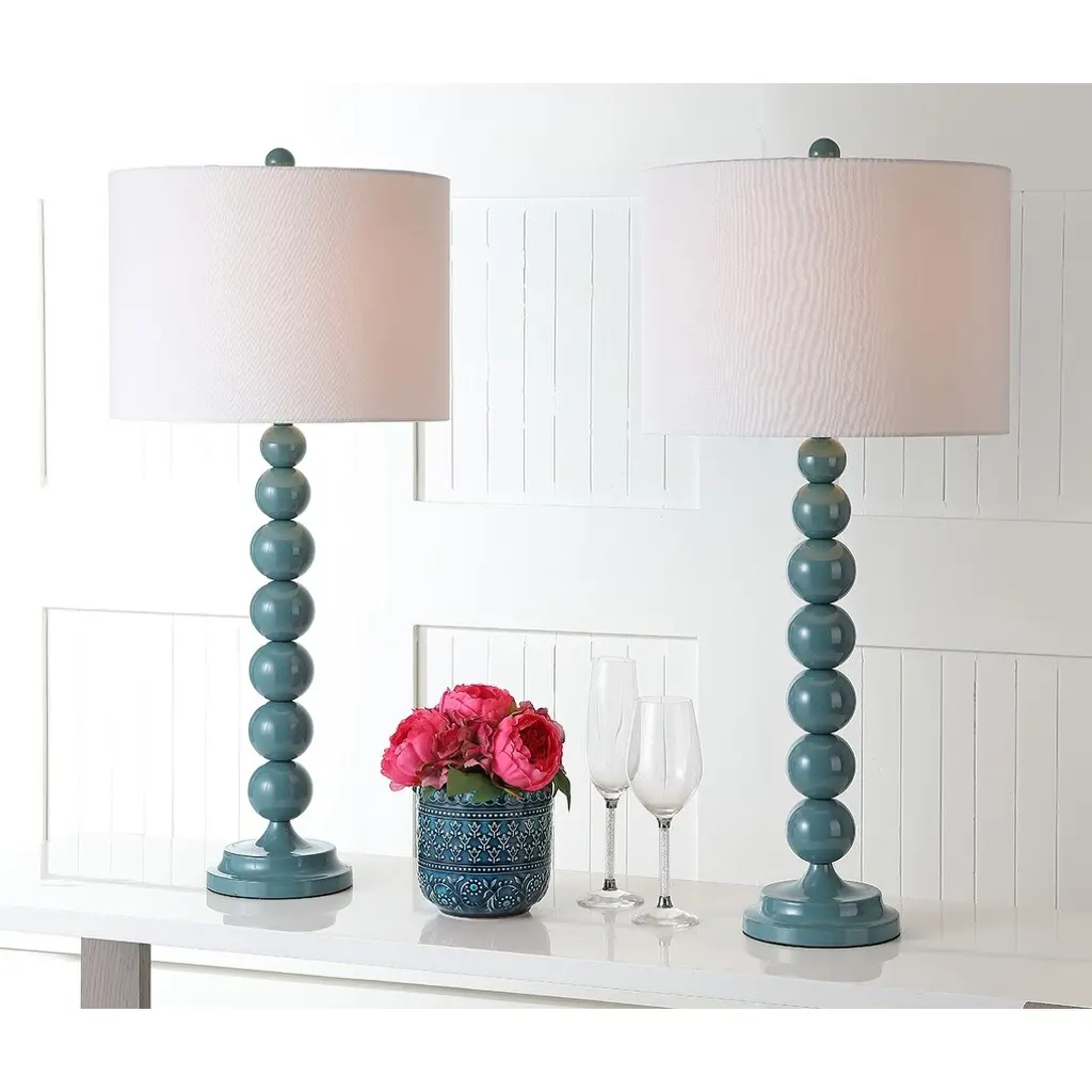Light up your life with the perfect symmetry of this gleaming marine blue stacked ball lamps. The tall, lean silhouette adds height on a console or hall table and the uniform color of base, neck and final are complemented by the white linen drum shade.Features:Setting: IndoorFixture finish: Marine BlueShades: Lighting has a linen white shadeSocket switchNumber of lights: 1Requires one (1) 100 watt bulb (included)Measures 31 inches high x 14 inches wide x 14 inches deep