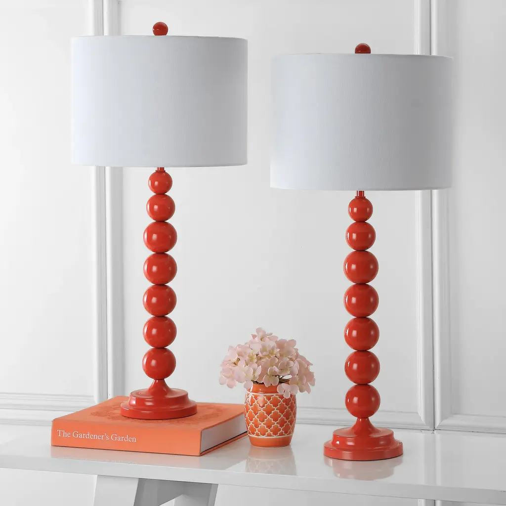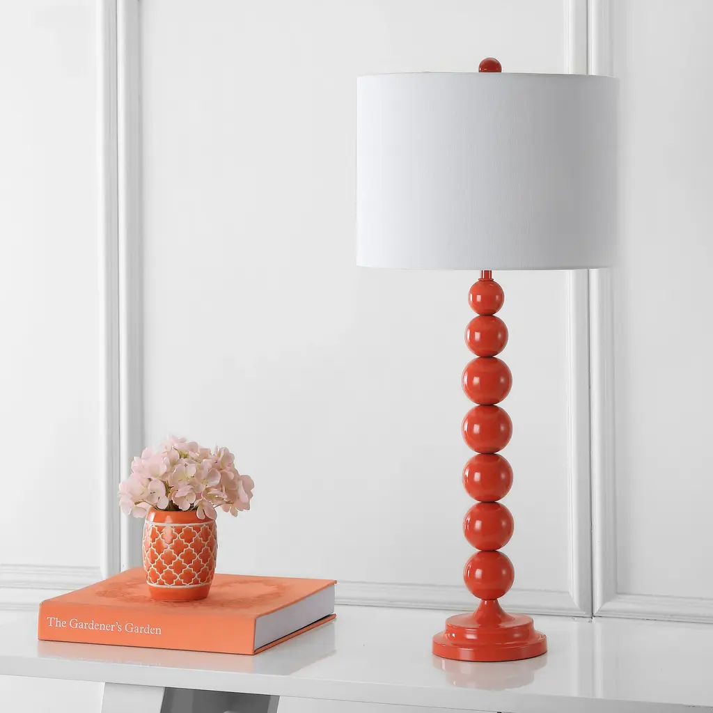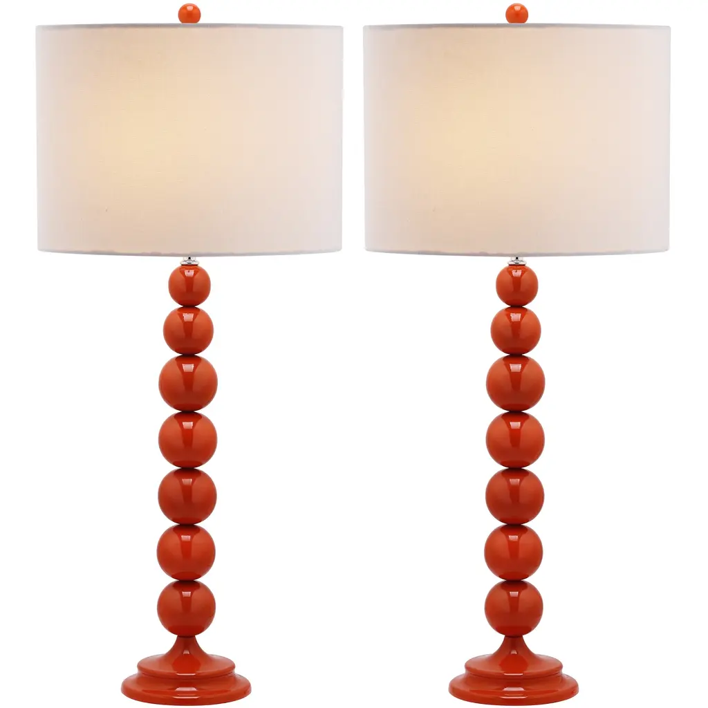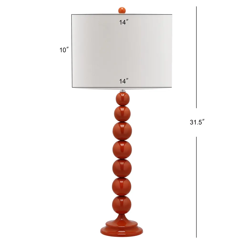 An eclectic modern style with a dash of fashion, these Jenna Orange Table Lamps from SAFAVIEH will instantly transform your decor into an abode of inspiration. The perfect symmetry of this shiny blood orange-colored stacked ball lamp adds extraordinary visual intrigue.The tall, lean silhouette adds height on a console or hall table, and the uniform color of the base, neck, and final are complemented by the white cotton drum shade.Features:Two (2) Compact Fluorescent light bulbs are includedLamp Color: Blood OrangeShade Fabric Material: CottonMetal Finish: Orange Base and NeckFinial Color: OrangeHarp Color: SilverBody Material: MetalItem Weight: 9.9 lbs.Cord Length: 59.6 inchesFull Dimensions: 14 inches wide x 14 inches deep x 31 inches highBefore cleaning any lamp shade or fixture, disconnect the power source. Wipe with a soft, dry cloth. Avoid the use of chemicals and household cleaners as they may damage the finish.Assembly required.