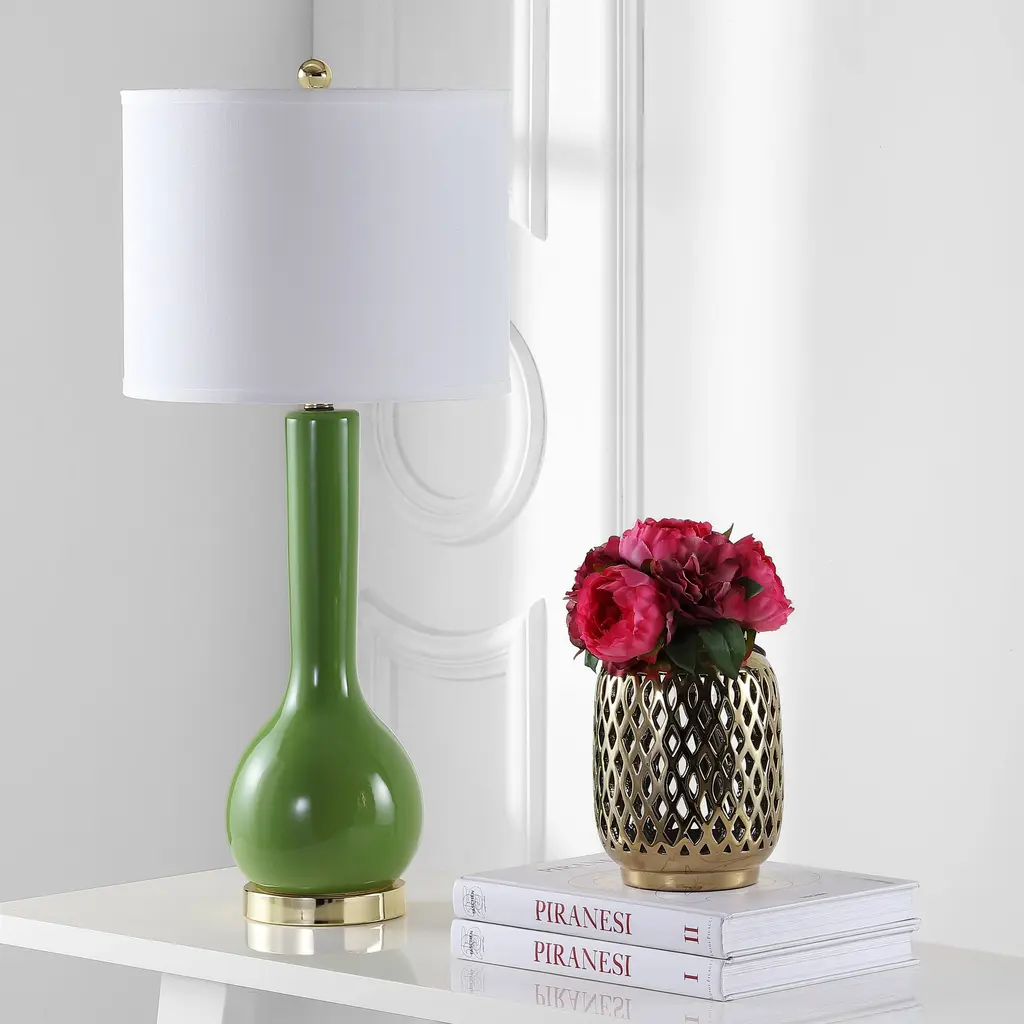 Inspired by a classic pottery form, this single gourd ceramic lamps with extra-long neck lends a stately but contemporary presence in any room. Shown in green with brushed gold base and neck, this artful lamp is complemented with a contemporary white linen drum shade.Illuminate your living room or bedroom with this set of two table lamps by SAFAVIEH. White linen drum shades offer soft accent lighting while the elegant lamp bases give the set refined style. Place these lamps on accent tables next to your sofa or bed to create an upscale, modern look in your home.Features:Setting: IndoorFixture finish: GreenShades: Lighting has a linen white shadeSocket switchNumber of lights: 1Requires one (1) 100 watt bulb (included)Measures 30.5 inches high x 14 inches wide x 14 inches deepAssembly required.