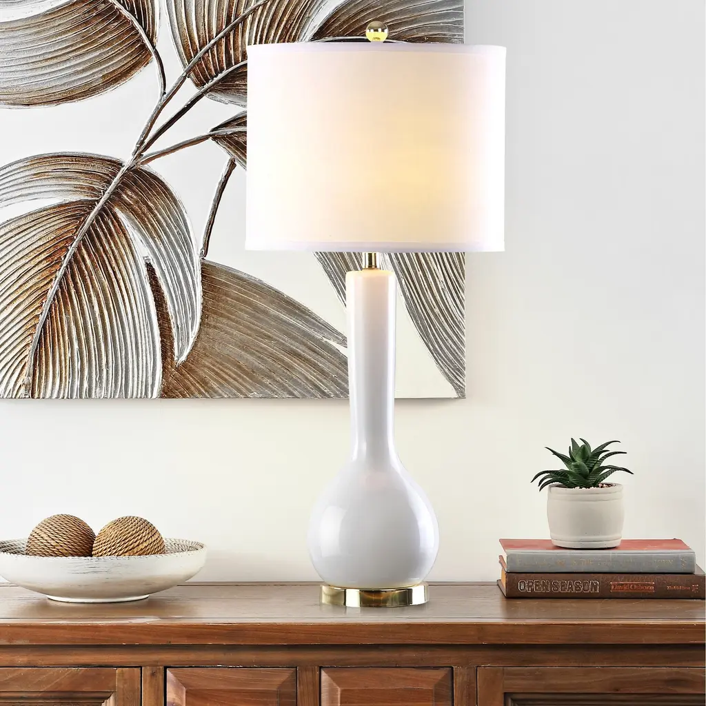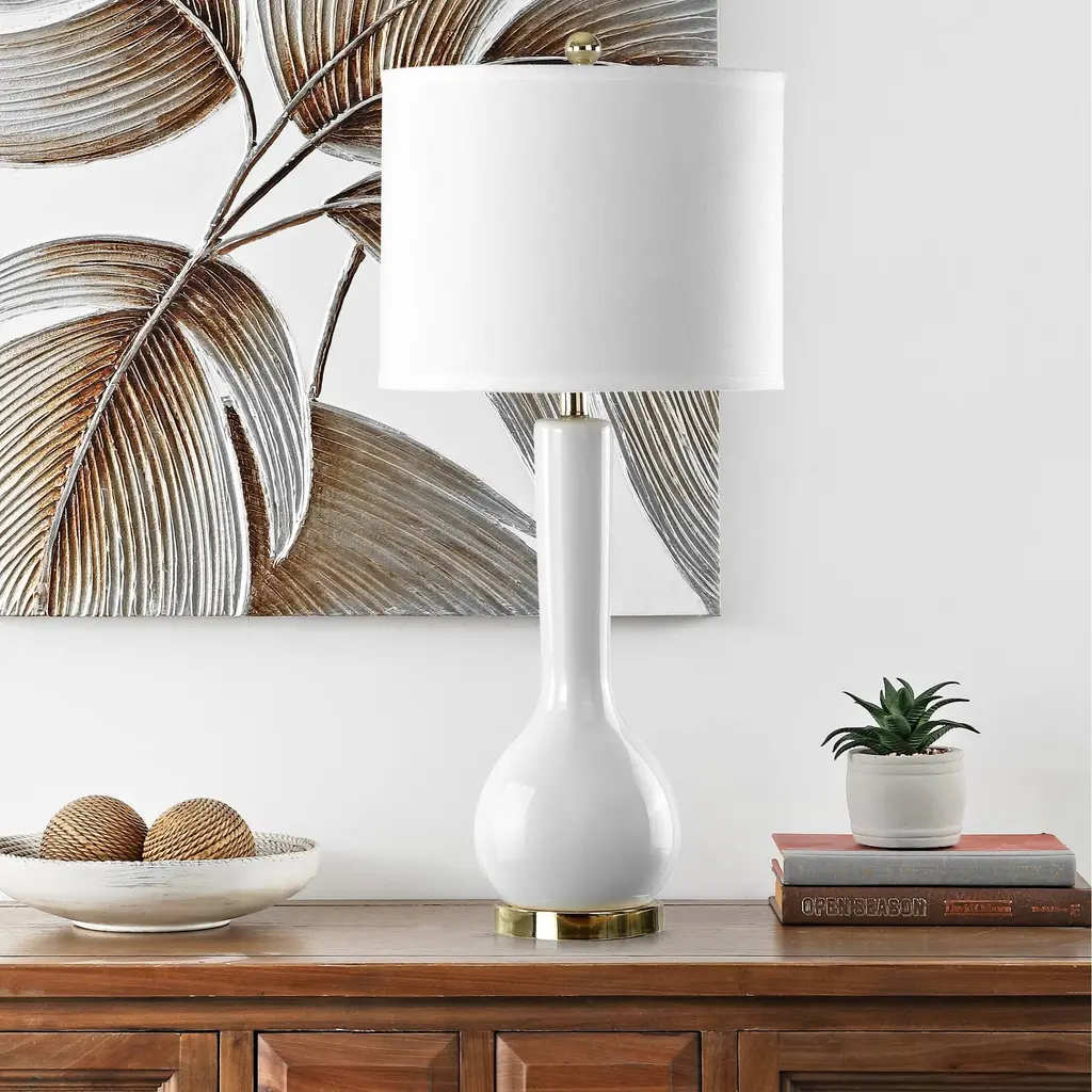 Inspired by a classic pottery form, this single gourd ceramic lamp with an extra-long neck lends a stately but modern presence in any room. Shown in white with a brushed gold base and neck, this artful lamp is complemented with a contemporary white cotton drum shade.The perfect way to add instant elegance and the right dose of brilliance to any room, this pair of Mae table lamps are a practical neutral design solution. Perfect to place by the bedside or in the living room, these lamps will add a clean and balanced look to your home decor.Features:Lamp Color: WhiteShade Fabric Material: CottonBody Material: CeramicMetal Finish: Gold Base and NeckFinial Color: GoldHarp Color: GoldFull Dimensions: 14 in. W x 14 in. D x 30.5 in. HRequires One (1) 100 watt bulb per lamp (included)Item Weight: 12.1 lbs.Cord Length: 59.6 in.Before cleaning any lamp shade or fixture, disconnect the power source. Wipe with a soft, dry cloth. Avoid the use of chemicals and household cleaners as they may damage the finish.Assembly required.