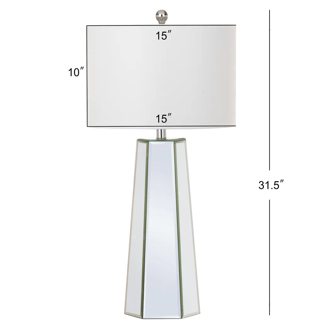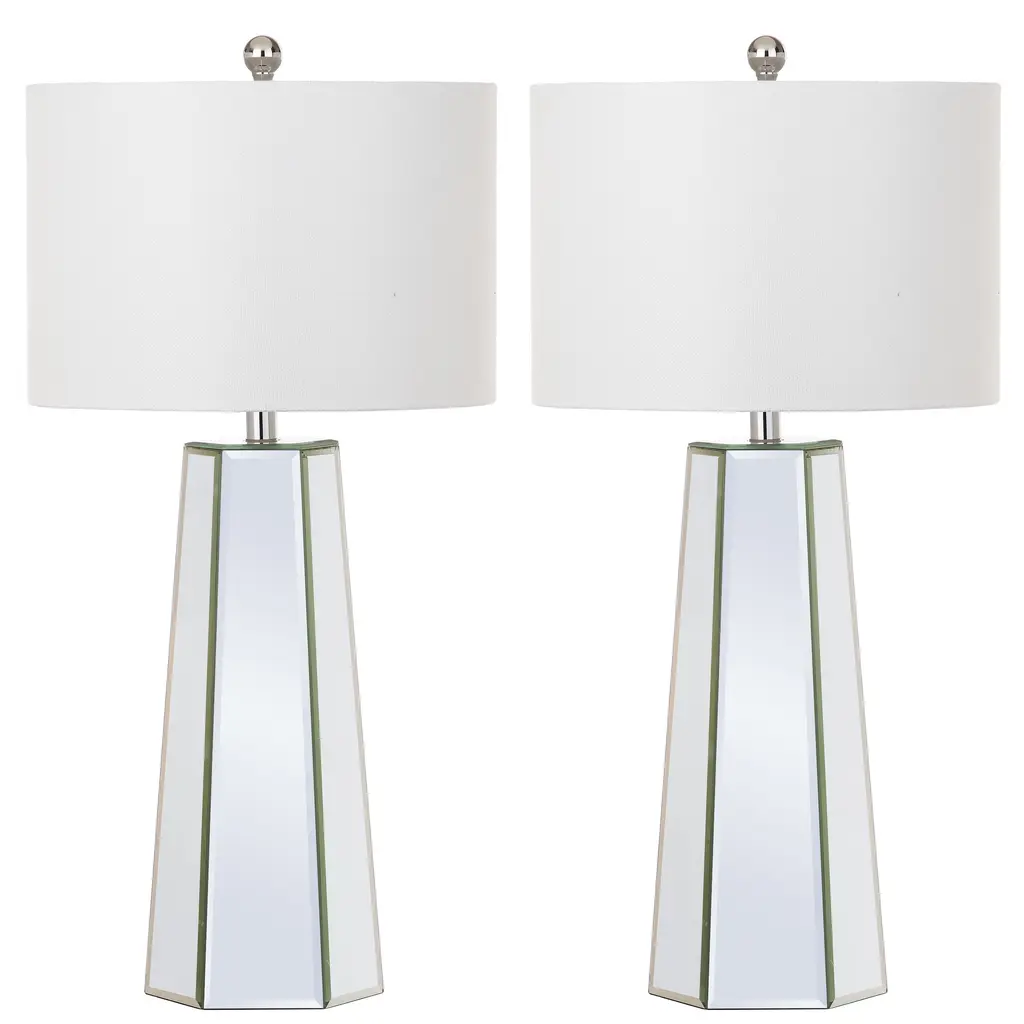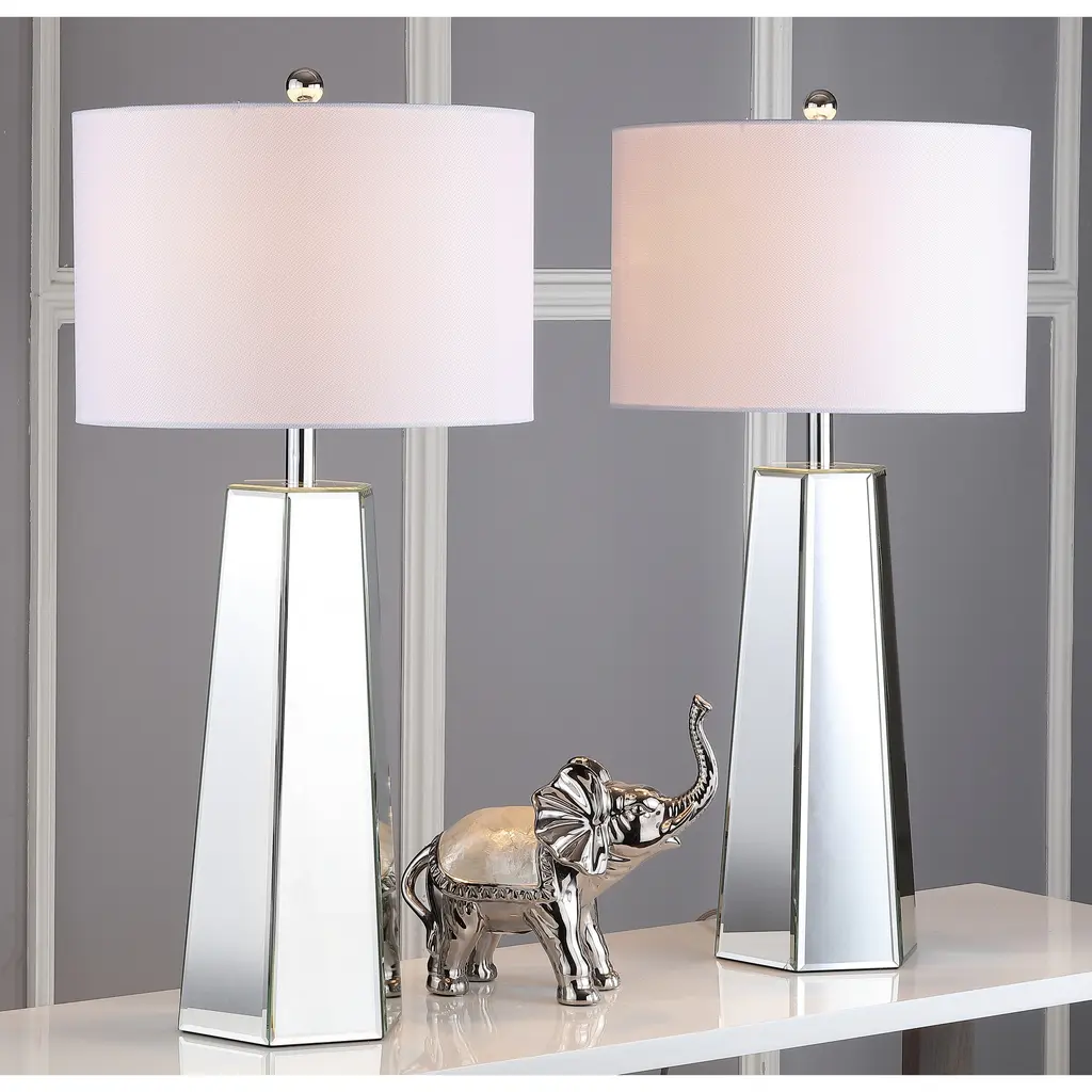 Designed to reflect the extravagant style of the boudoirs of Old Hollywood s grand dames, this traditional mirror table lamp (set of 2) is a classic. Paired with chic chrome detail, it reflects flattering, diffused light through its crisp off-white shade.Features:Number of Light: 2 LightsLight Bulb Type: Compact Fluorescent - CFLShade Material: Cotton ThreadBulb Wattage: 13WProduct Features: Bulbs Included, Energy EfficientCrafted of MetalHeight: 23 in or moreLumens: 830Setting: IndoorSwitch Type: Rotary SwitchLighting Style: Contemporary, TransitionalColor: CLEARMeasures 15 inches x 15 inches x 31 inches