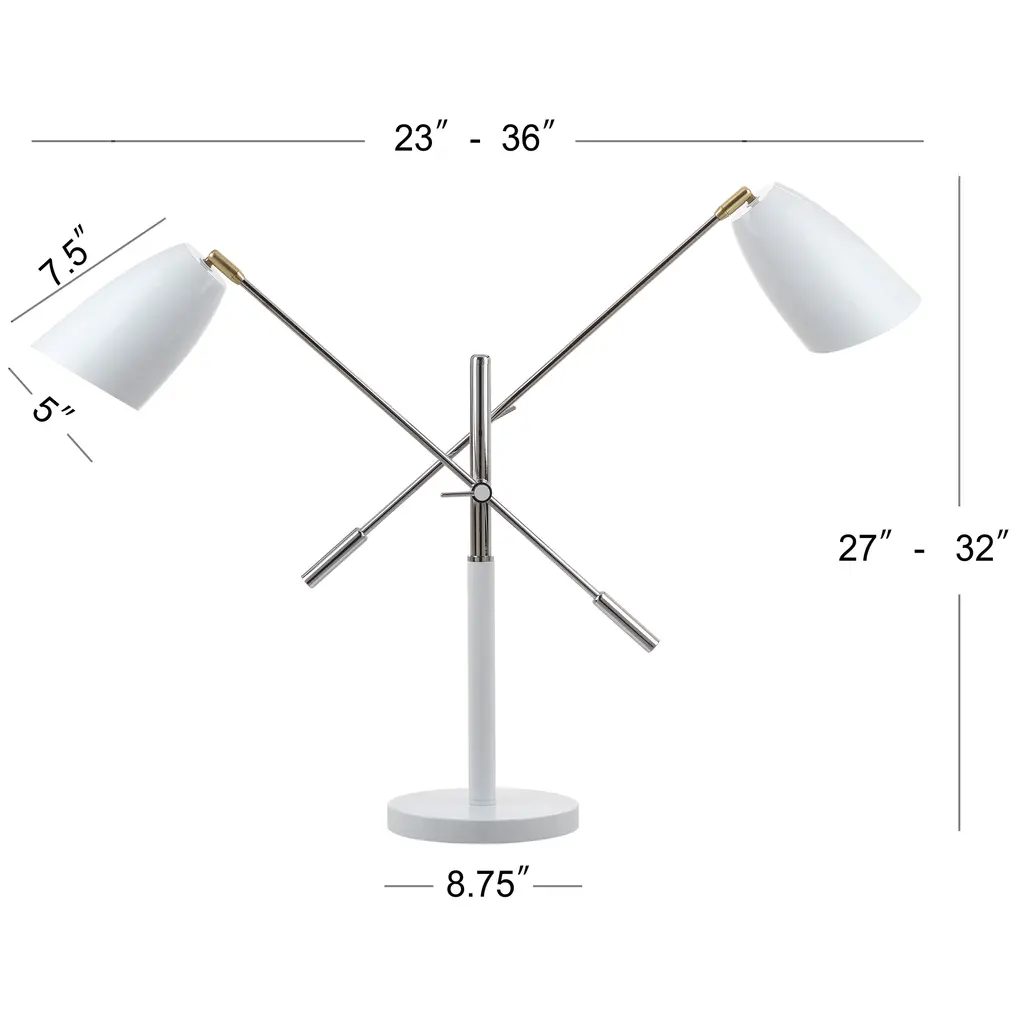 Inspired by the stylish designs that outfitted the offices of twentieth century advertising giants, this contemporary desk table lamp brings instant cache to any space. Finished in polished chrome, white and gold, its adjustable lights make it a modern marvel.Dimensions: 23Number of Light: 2 LightsLight Bulb Type: Compact Fluorescent - CFL Bulbs Included, Energy EfficientLighting Shade Color: CreamCrafted of metalLumens: 830Switch Type: On-Off Rotary SwitchLighting Style: ContemporaryColor: White
