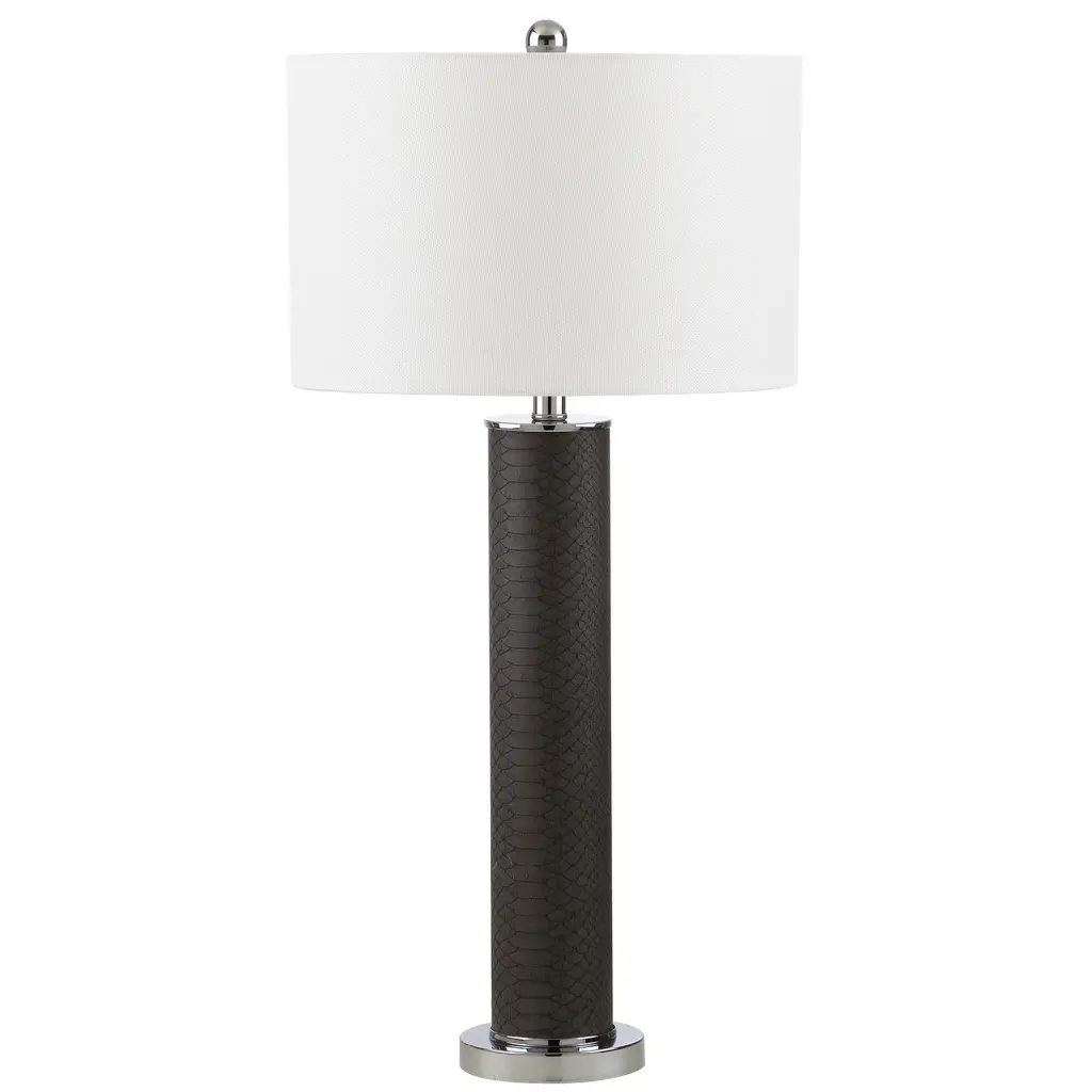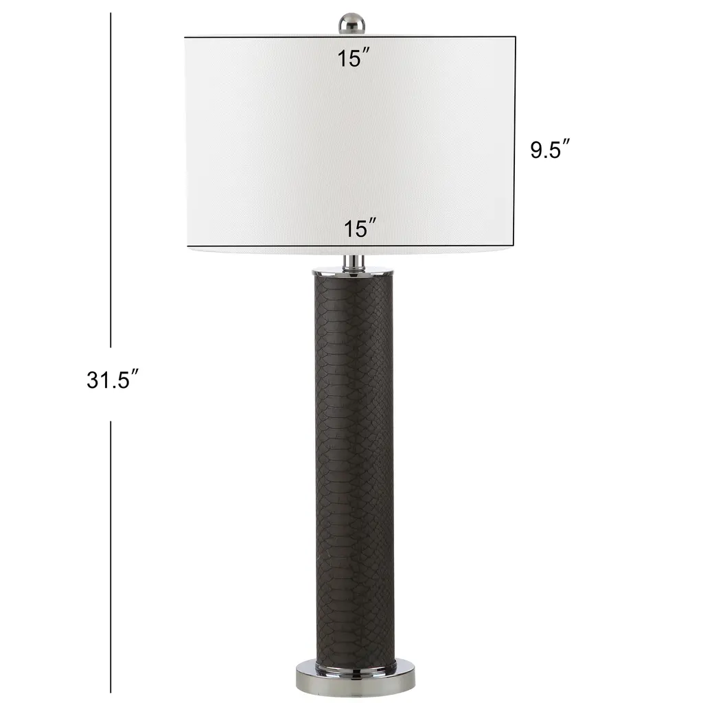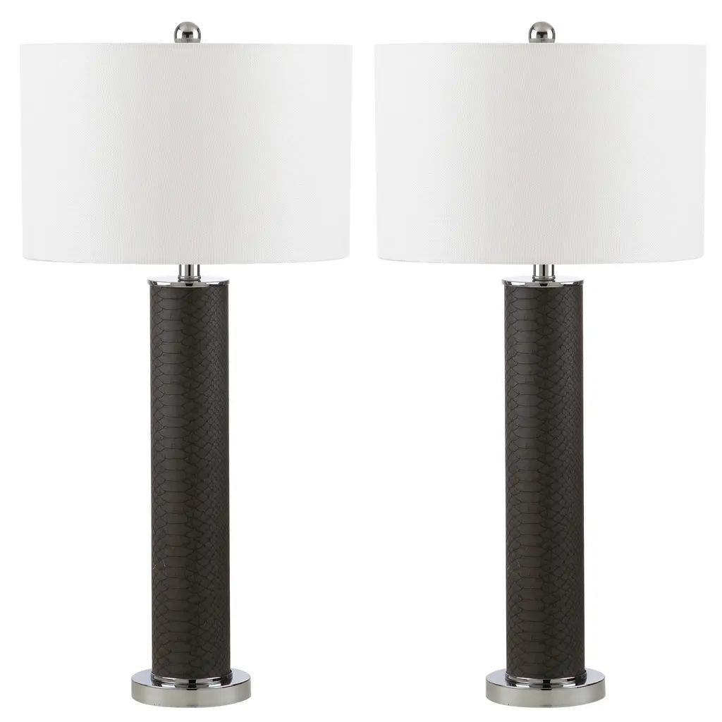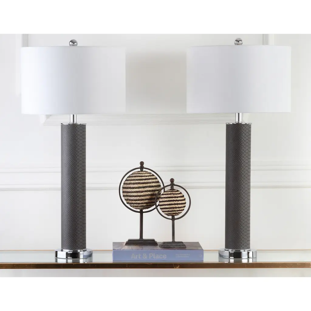 Illuminate your living room or study with this set of two stunning snakeskin lamps, which come with energy-efficient bulbs for a quick, easy setup. The color pattern of grey and white is ideally suited to neutral decor, while the simple rotary switch is intuitive and easy to use.Set includes: Two piecesShade color: WhiteLamp base finish: Faux snakeskinNumber of Light: 2 LightsLight Bulb Type: Compact Fluorescent - CFLShade Material: Cotton ThreadBulb Wattage: 13WProduct Features: Bulbs Included, Energy EfficientCrafted of Plastic, MetalSetting: IndoorSwitch Type: Rotary SwitchLighting Style: Contemporary, TransitionalColor: GreyMeasures 31.5 inches high x 15 inches in diameter