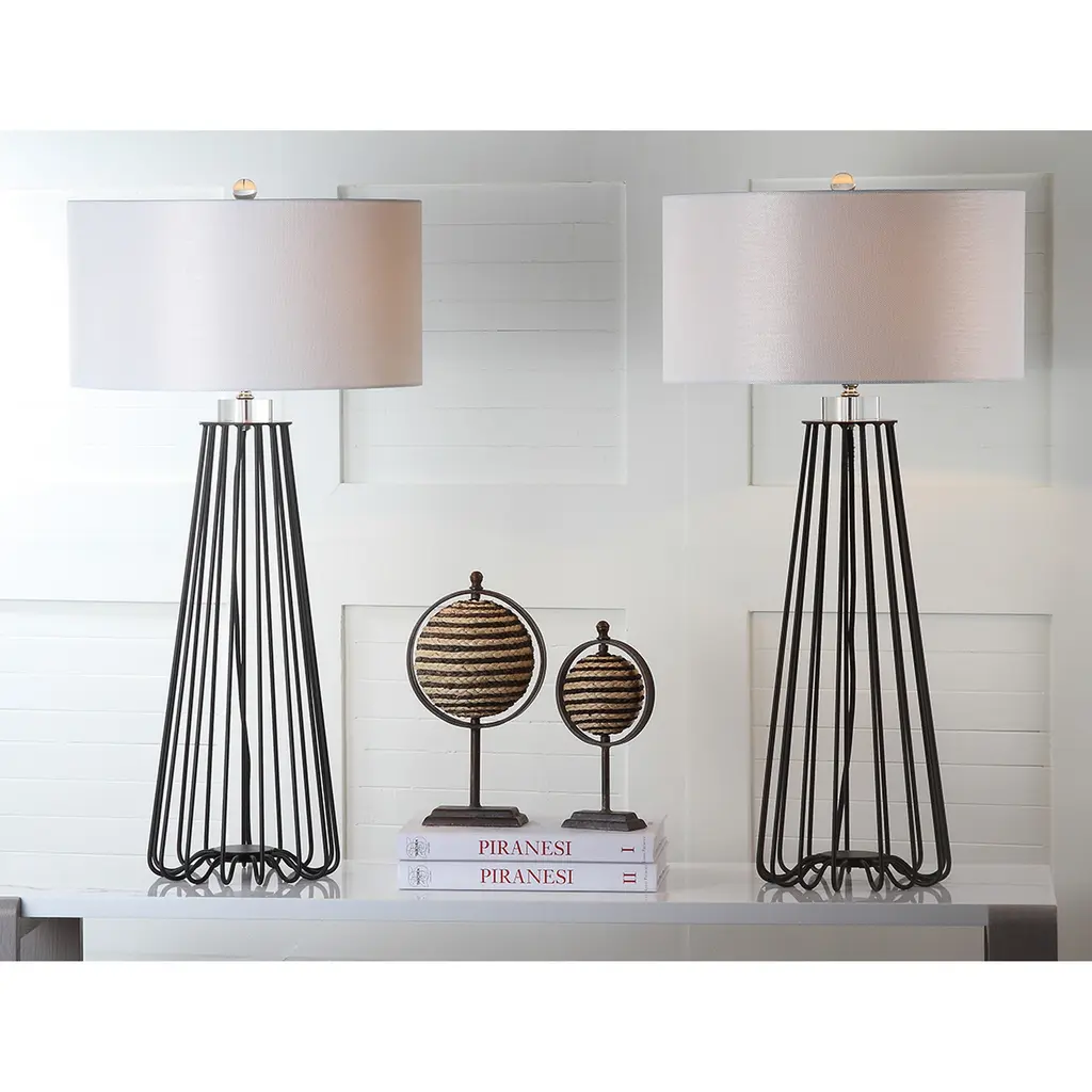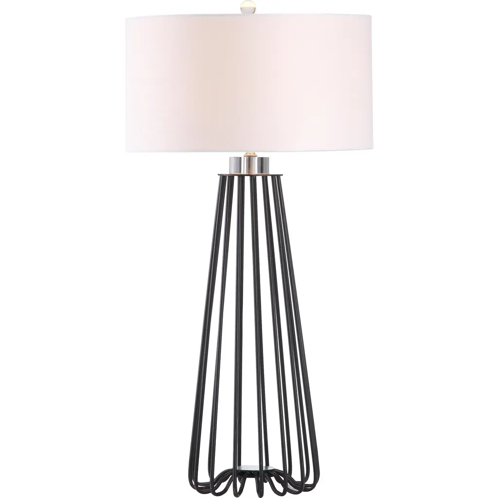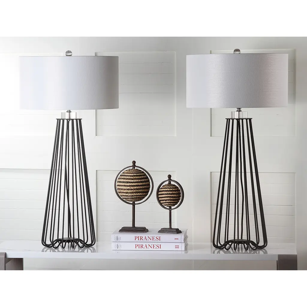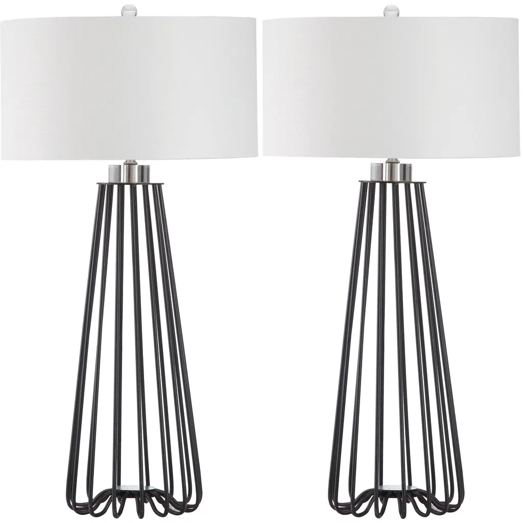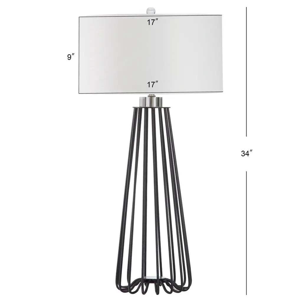 Sleek and sturdy, this open-concept lamp set from SAFAVIEH will light your space in modern style. The caged black iron bases are topped with classic white cotton drum shades and accented with chic acrylic finials. Use this set to complete your bedroom decor or brighten up your living room.Features: Set of 2 table lamps Crystal base and finial Crafted from sturdy iron UL lamp certified Black metal industrial design Off-white cotton shades Switch mechanism: Rotary switch Conveniently includes one (1) LED bulb per table lamp Full dimensions are 17" wide x 17"deep x 34" high Before cleaning any lamp shade or fixture, disconnect the power source. Wipe with a soft, dry cloth. Avoid the use of chemicals and household cleaners as they may damage the finish. Assembly required