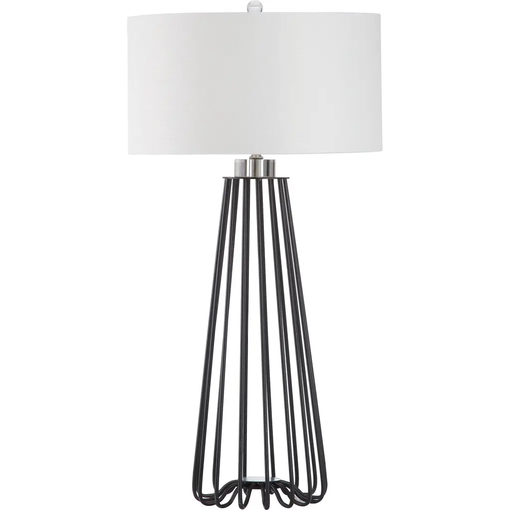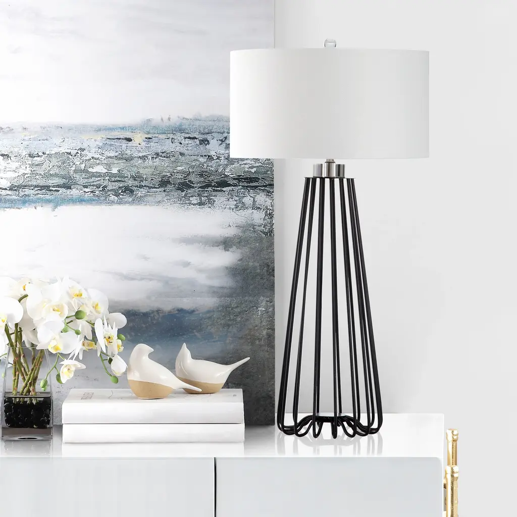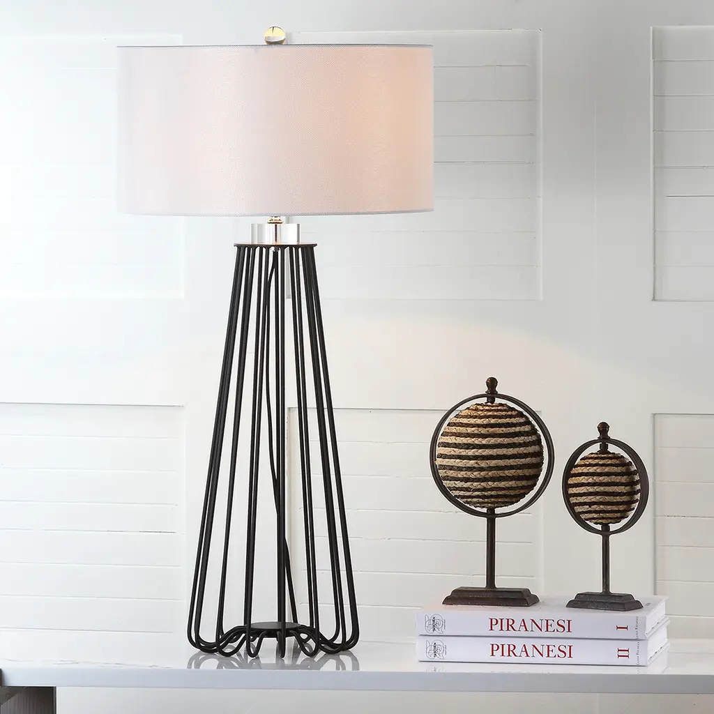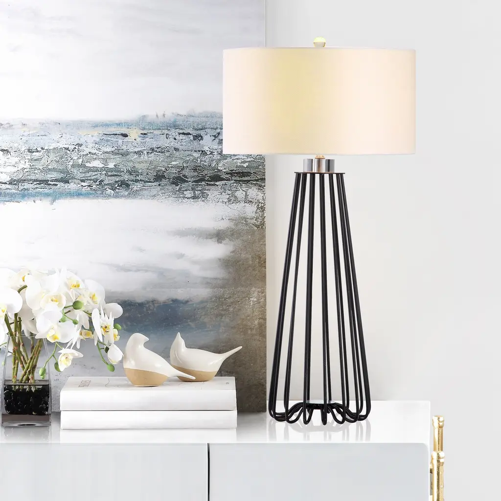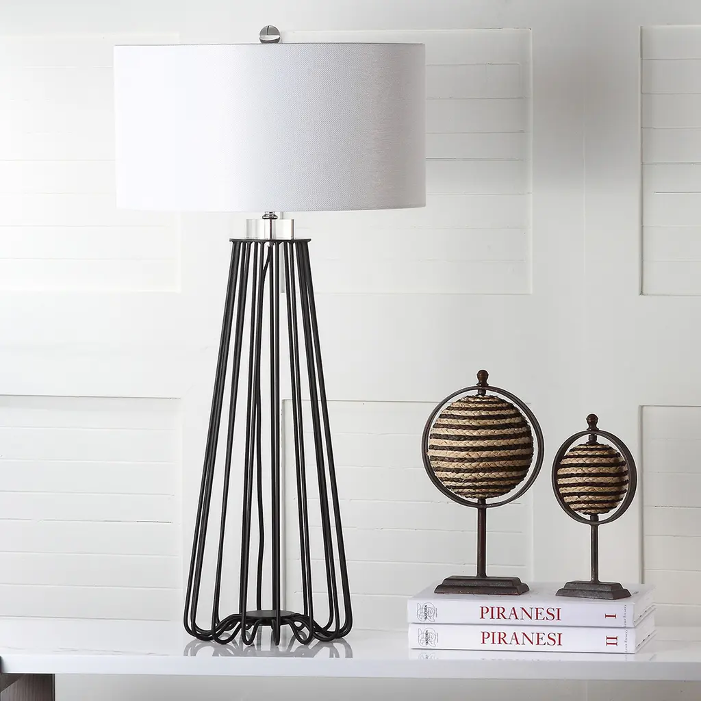 Sleek and sturdy, this open-concept lamp set from SAFAVIEH will light your space in modern style. The caged black iron bases are topped with classic white cotton drum shades and accented with chic acrylic finials. Use this set to complete your bedroom decor or brighten up your living room.Features: Set of 2 table lamps Crystal base and finial Crafted from sturdy iron UL lamp certified Black metal industrial design Off-white cotton shades Switch mechanism: Rotary switch Conveniently includes one (1) LED bulb per table lamp Full dimensions are 17" wide x 17"deep x 34" high Before cleaning any lamp shade or fixture, disconnect the power source. Wipe with a soft, dry cloth. Avoid the use of chemicals and household cleaners as they may damage the finish. Assembly required