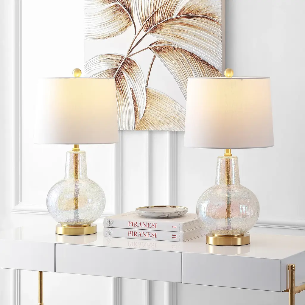 This stunning contemporary electric table lamp radiates beauty. Designed with crackle glass, its hammered texture instantly upgrades any room with its modern luxurious style. Often used in by designers in pairs to frame a sofa, its cotton shade is complimentary.