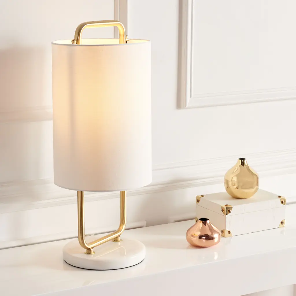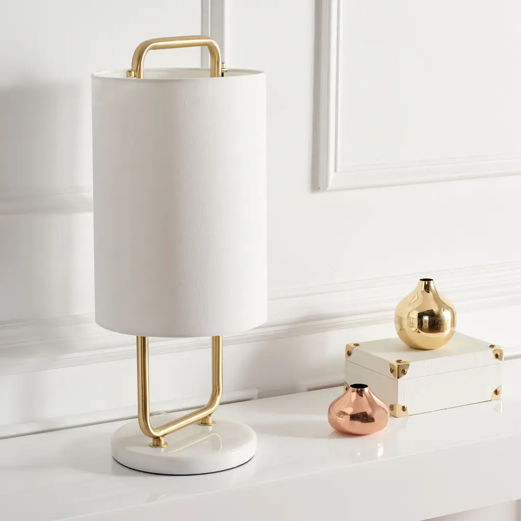 An icon of glamorous modern minimalism, this glimmering Giulia Table Lamp is a must-have for today's celebrity-chic interiors. Giulia's circular white marble base and white cylinder shade pair perfectly with the rounded corners of its open gold frame.