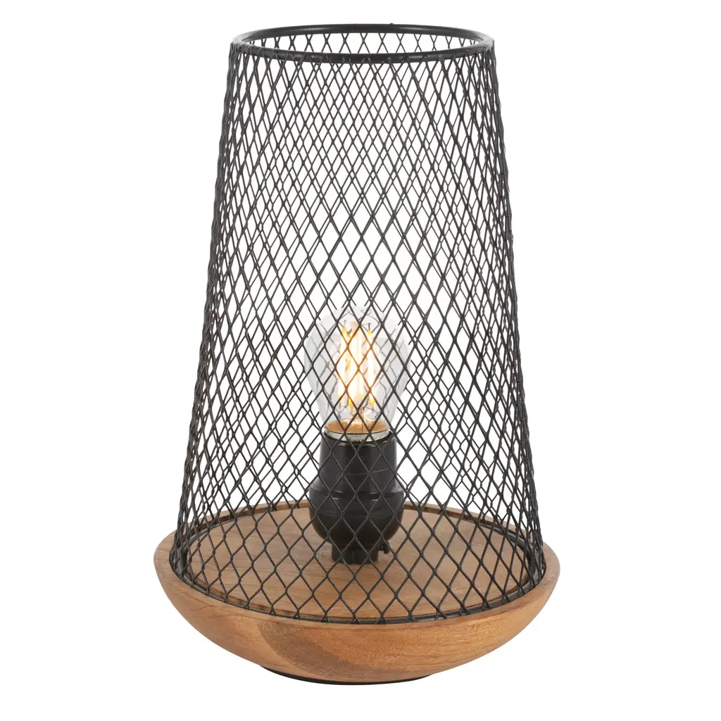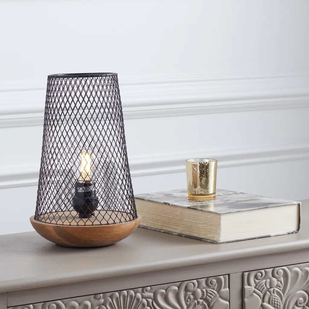 Uplift the style and ambiance of your home with Haynes table lamp. The lamp is enclosed within a wire mesh cage to bring sleek and effortless style to your home. It combines the industrial charm of metal with the organic beauty of wood to serve as a modern lantern. When lit, our table can amp up light to serve as the perfect complement to your dining table or any surface that requires mood lighting.