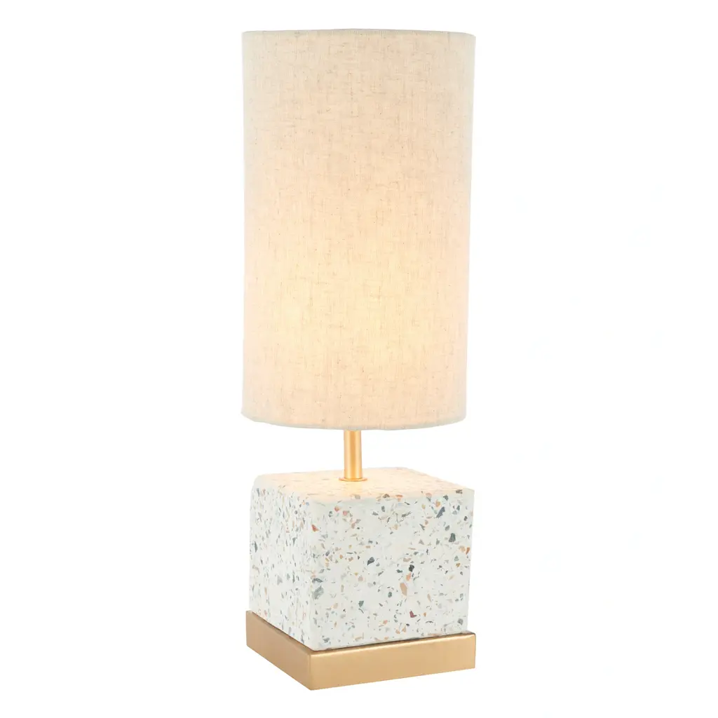 Add a modern and lively flair to your home with the Jarelle table lamp. The concrete base of the table lamp is speckled with stone fragments to serve as a playful and welcoming addition to your home. Its tall drum shade creates a sleek contrast with the rectangular concrete body. Accented with a gold metallic finish, the table lamp showcases a dramatic play of textures, shapes, and proportions to enliven any bare surface of your home.