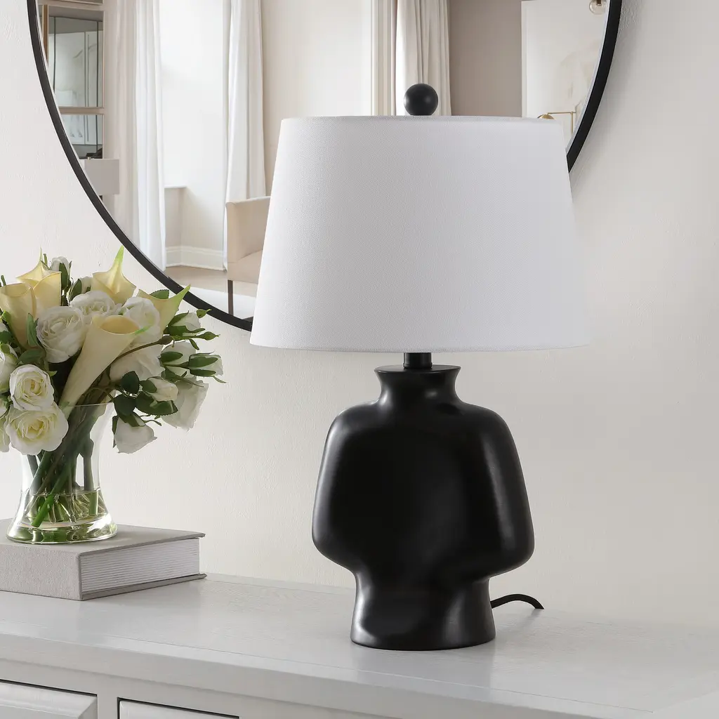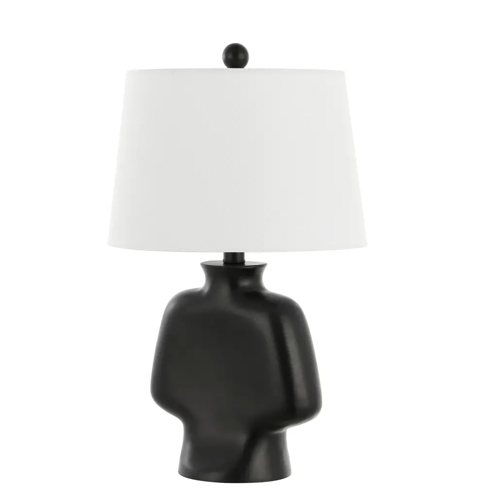 Add a touch of elegance and drama to your home with the captivating Johari table lamp. This modern lamp features bold and curvaceous contours, making it a sophisticated and artistic focal point in any room. With its contrasting black sculptural body and sleek white shade, it adds a high visual impact to any corner. The Johari table lamp beautifully filters light, creating the perfect ambiance next to a sofa, armchair, or bed.Features: